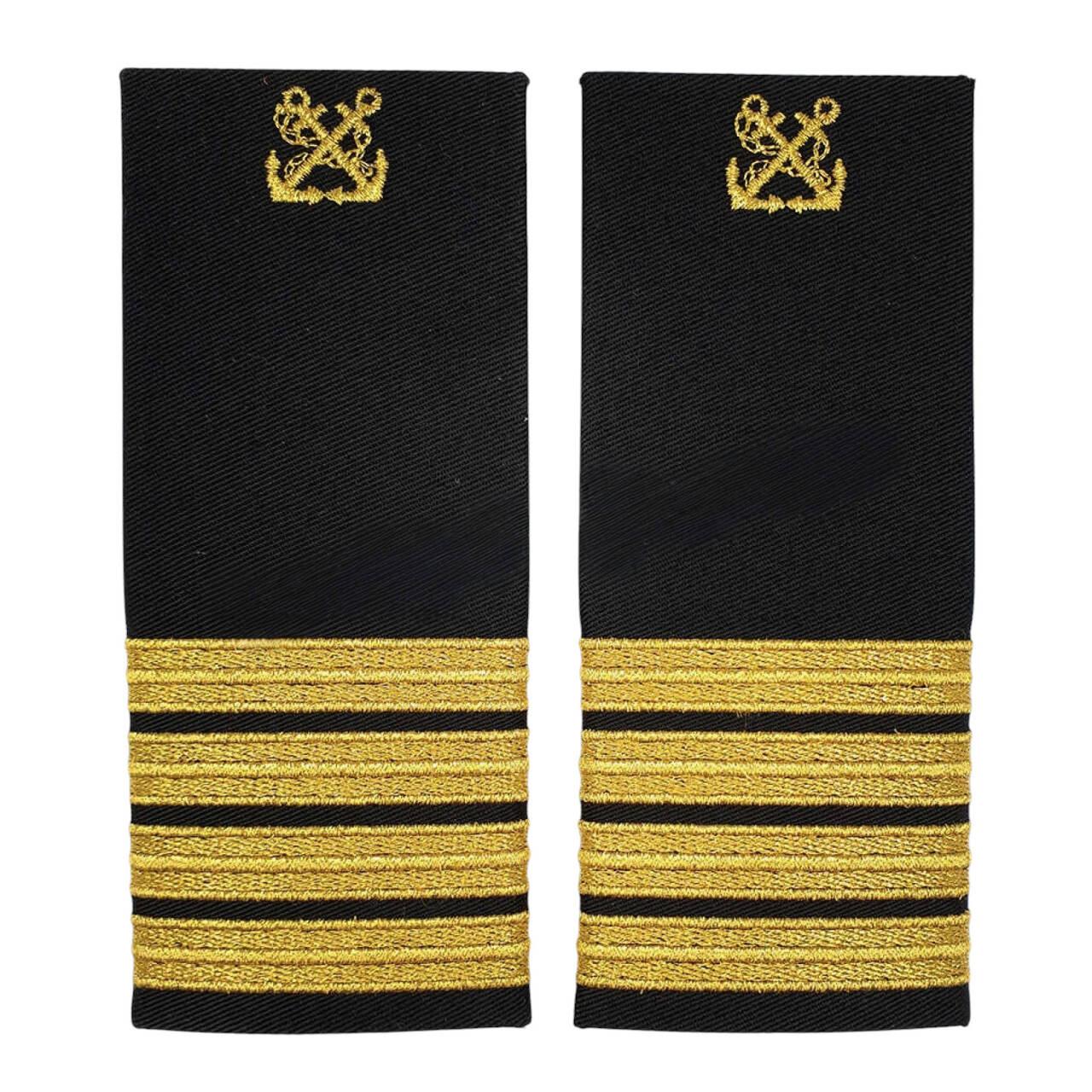 Grade Capitan I de port ANR brodate cu fir metalic auriu pe un suport confectionat din tesatura cu compozitia 65/35% bumbac/poliester de culoare neagra cu intaritura termocolata. Sunt potrivite pentru functiile de executie cu studii superioare din capitanii zonale si inspectorate tehnice.