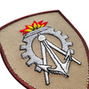 Aceasta Emblema Geniu este o emblema brodata cu fir Madeira Polyneon 100% polyester. Suportul este realizat din tesatura de culoare khaki, bej sau combat (camuflaj) terestru cu intaritura din material termocolat, in raportul 65/35% bumbac/polyester.