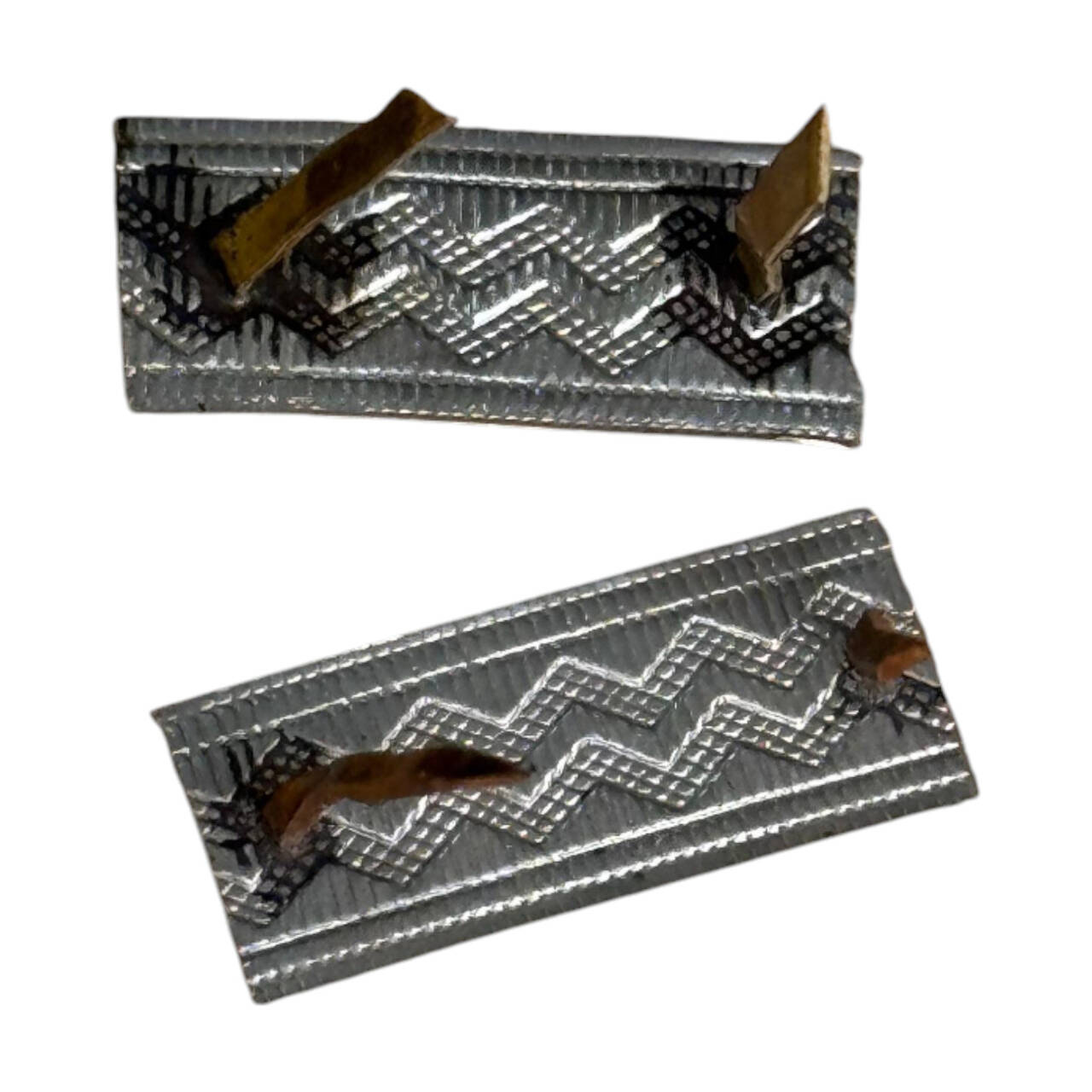 PAIR OF RANK INSIGNIA - METAL RANKS - SERGEANT, PLATOONIER - RSR PERIOD - MILITARY SURPLUS ROMANIAN ARMY - SILVER - IN GOOD CONDITION