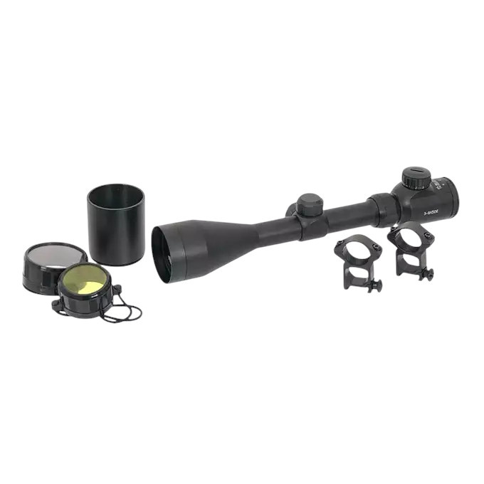 The telescope is made of metal, it has a backlit of red and green colors with a cross reticle (10 steps of adjustable backlight intensity: 5 degrees in green and 5 degrees in red).