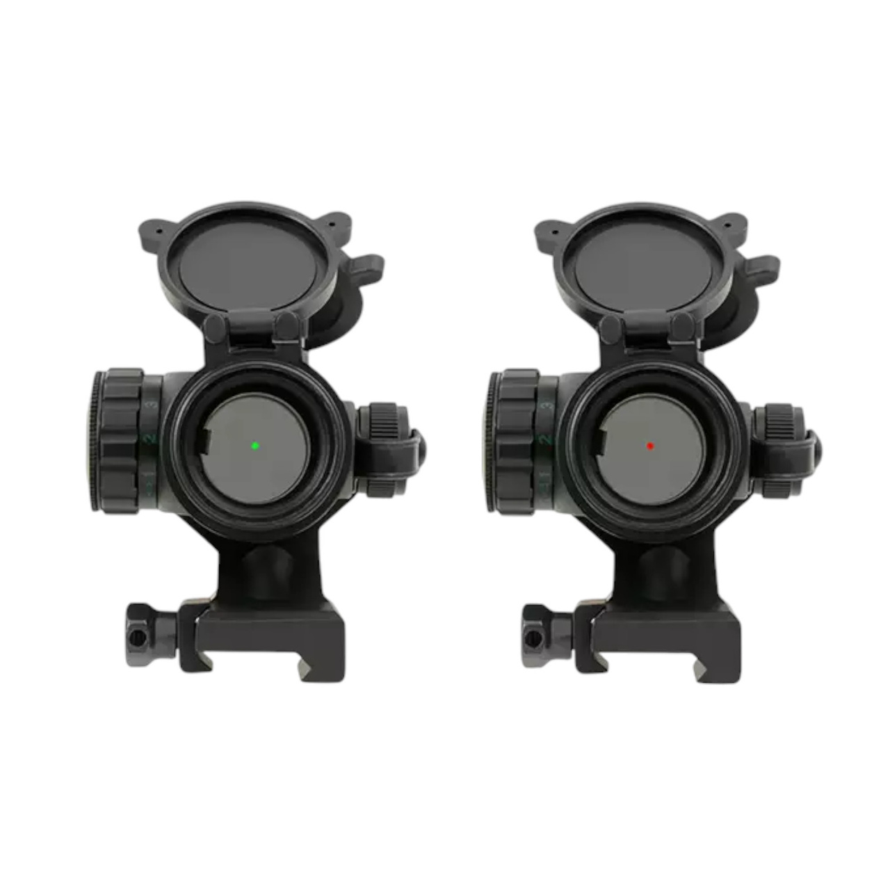 A replica of the Standard Sight, used by the US Army and most special forces worldwide. Made of aluminum, and features dots in two colors (green, and red) with adjustable brightness, and flip-up lens caps in a set.