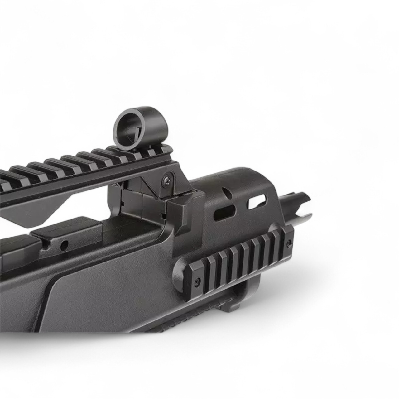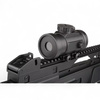 The carbine is equipped with a 22 mm RIS mounting rail located on the upper handle, ideal for attaching various optical sights, including the enclosed red dot sight included in the package. The front grip is fitted with three 22 mm RIS rails, offering multiple customization options with tactical accessories. The battery is mounted inside the front grip and can be quickly removed by pressing a single button.