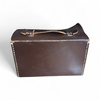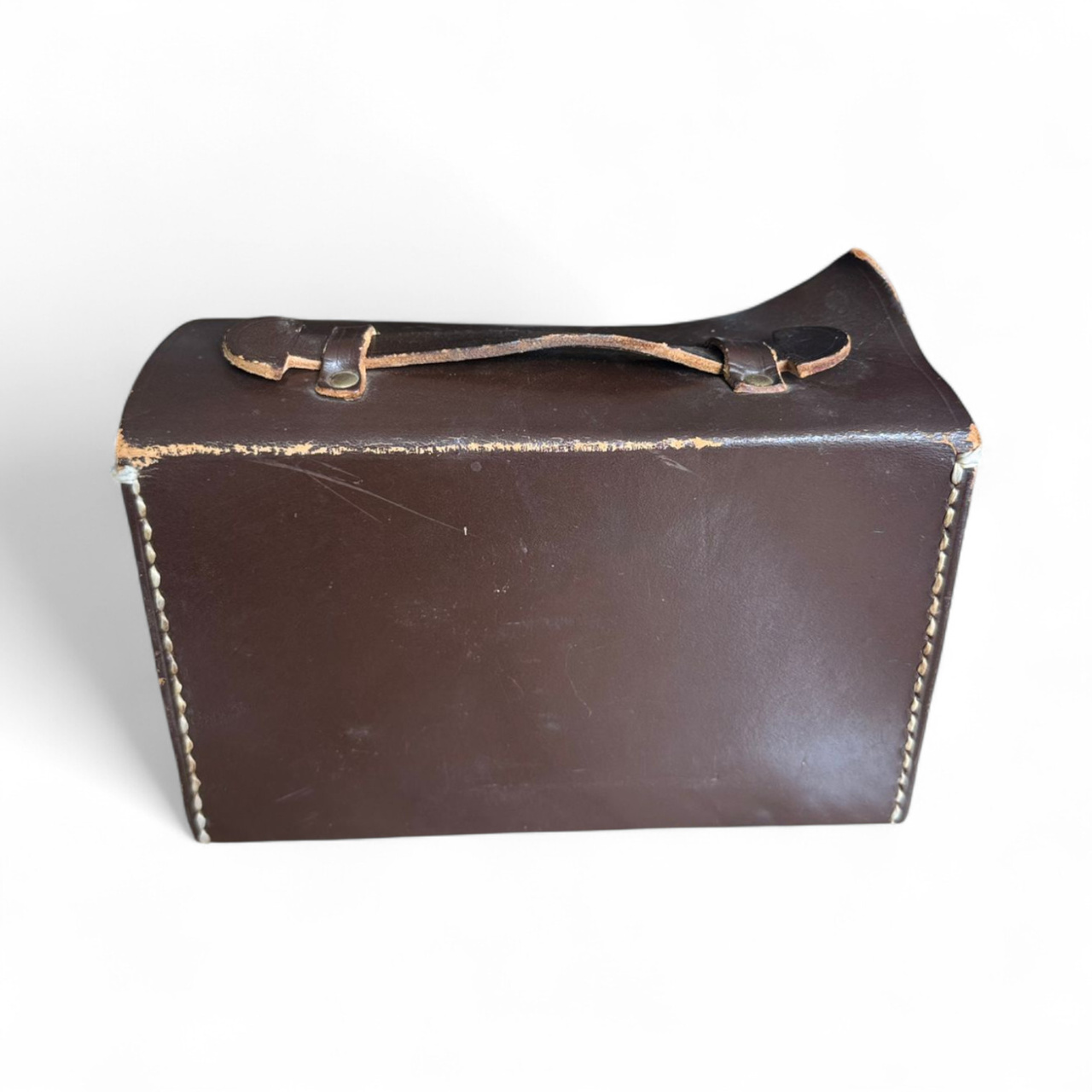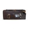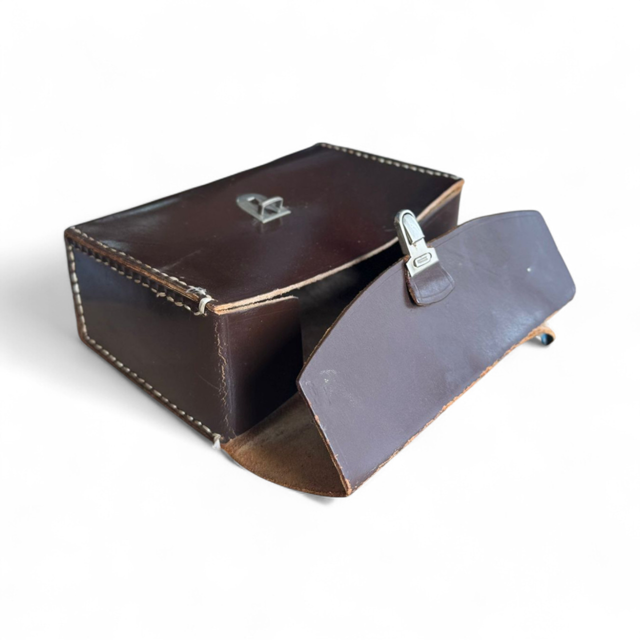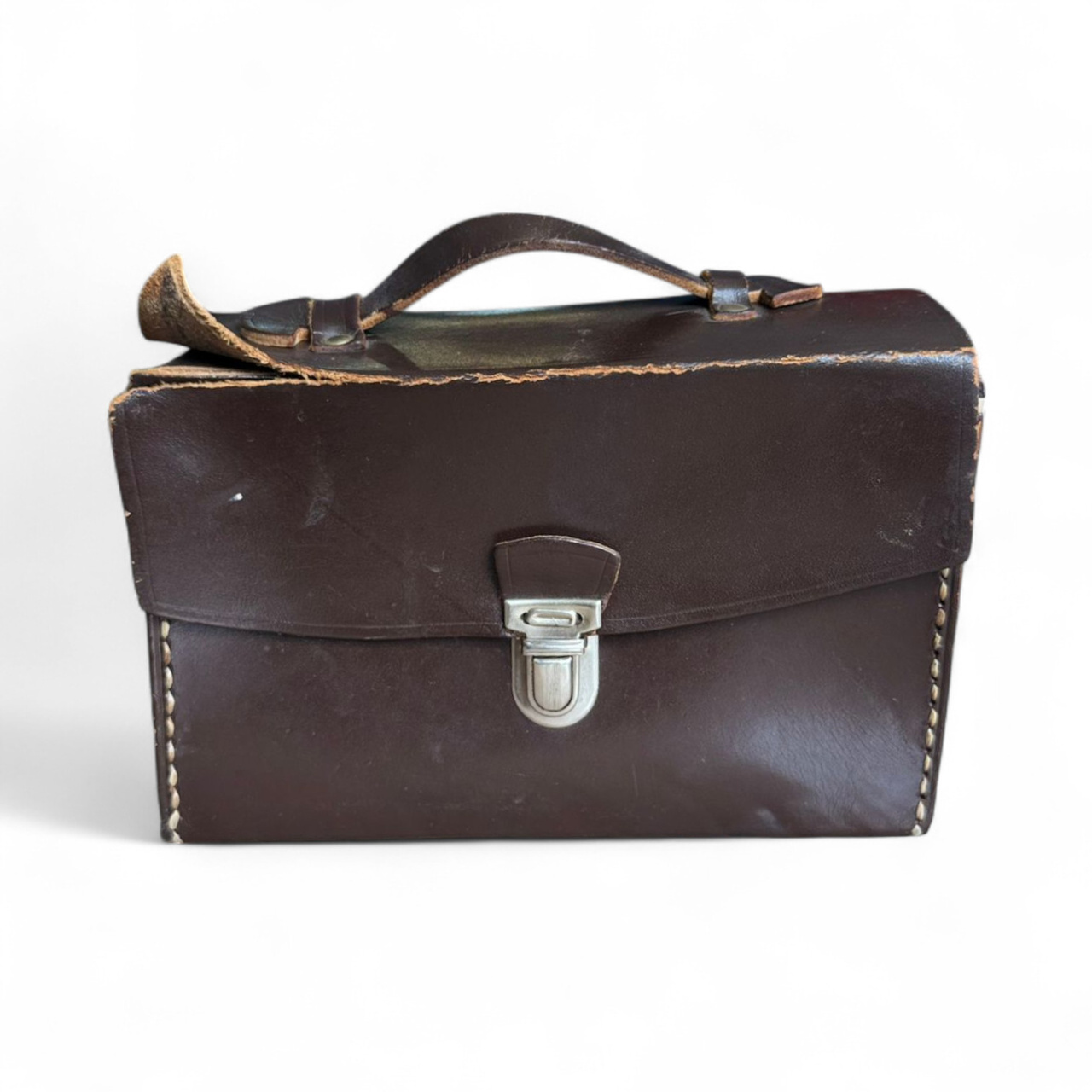 Vintage bag made of natural leather, Romanian military surplus, originally used by military personnel to carry documents and office accessories in the field. Made of thick brown leather, with a sturdy metal clasp and top handle for easy transport.