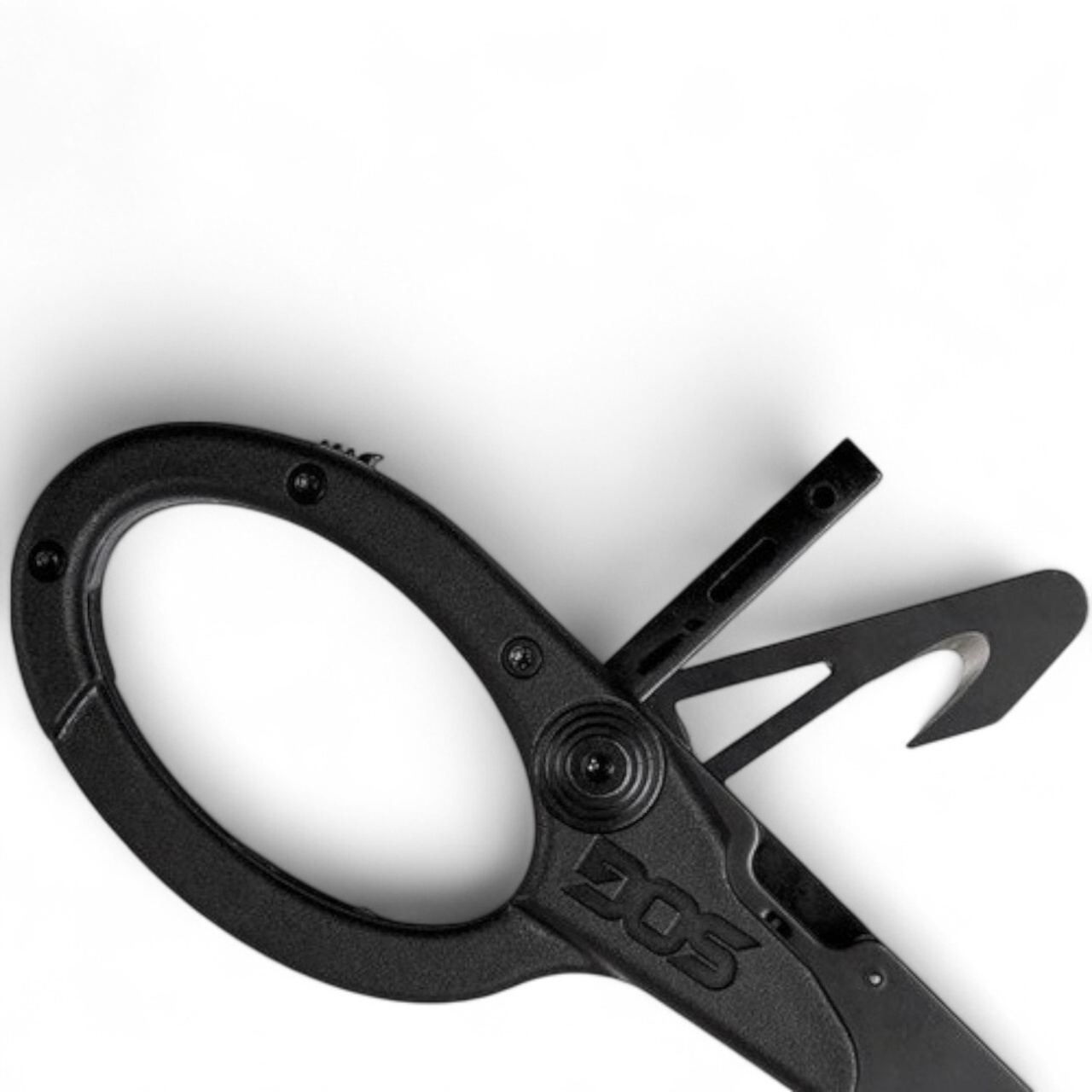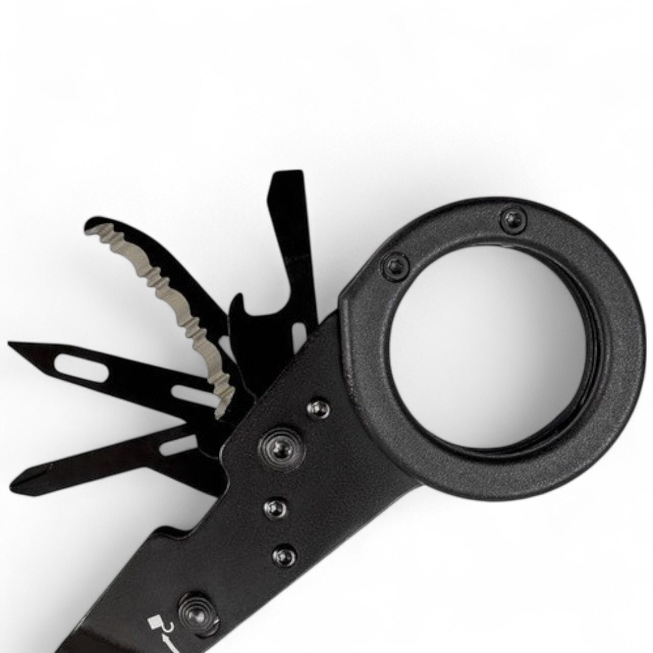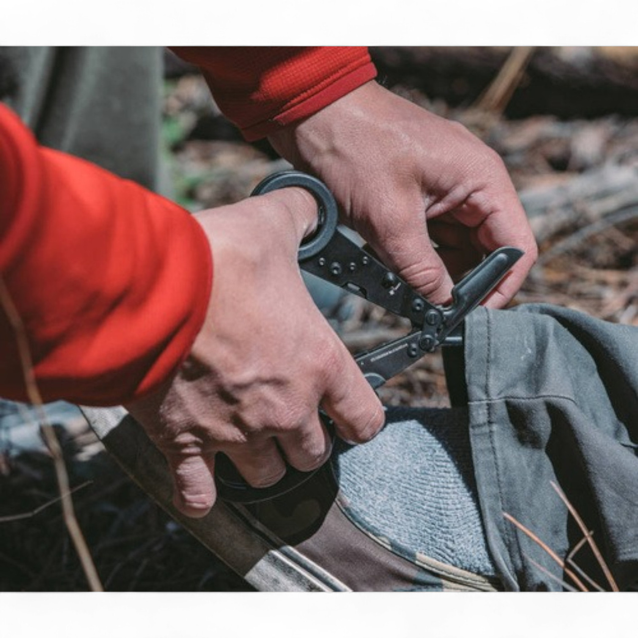 Folding rescue scissors with 11 integrated tools, useful for equipping emergency personnel, military paramedics, home or car first aid kits.