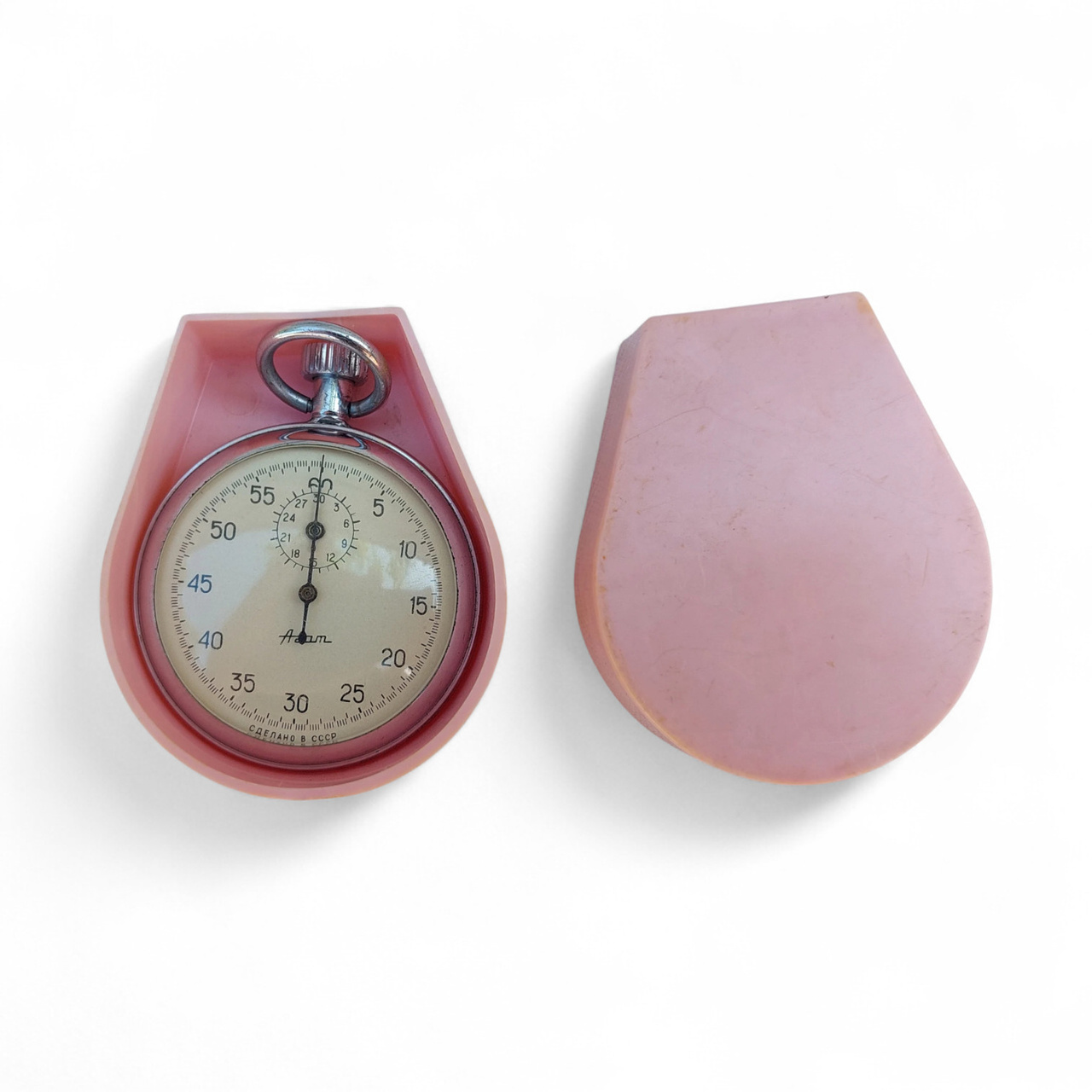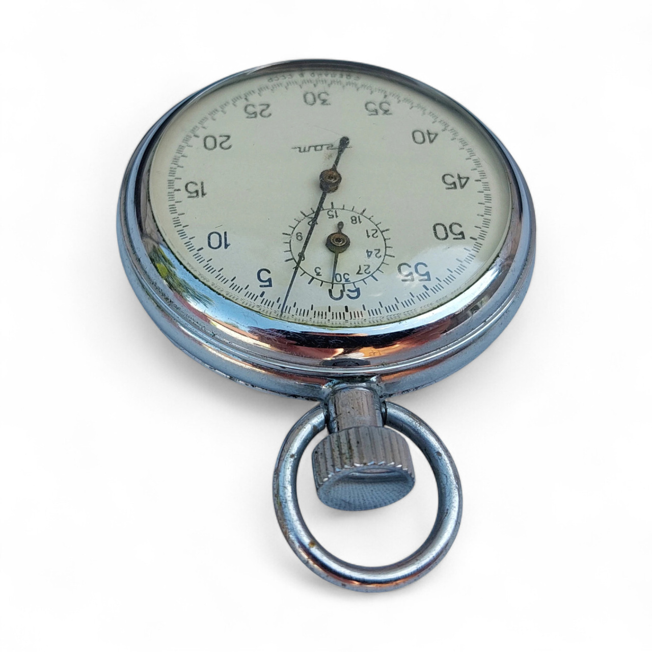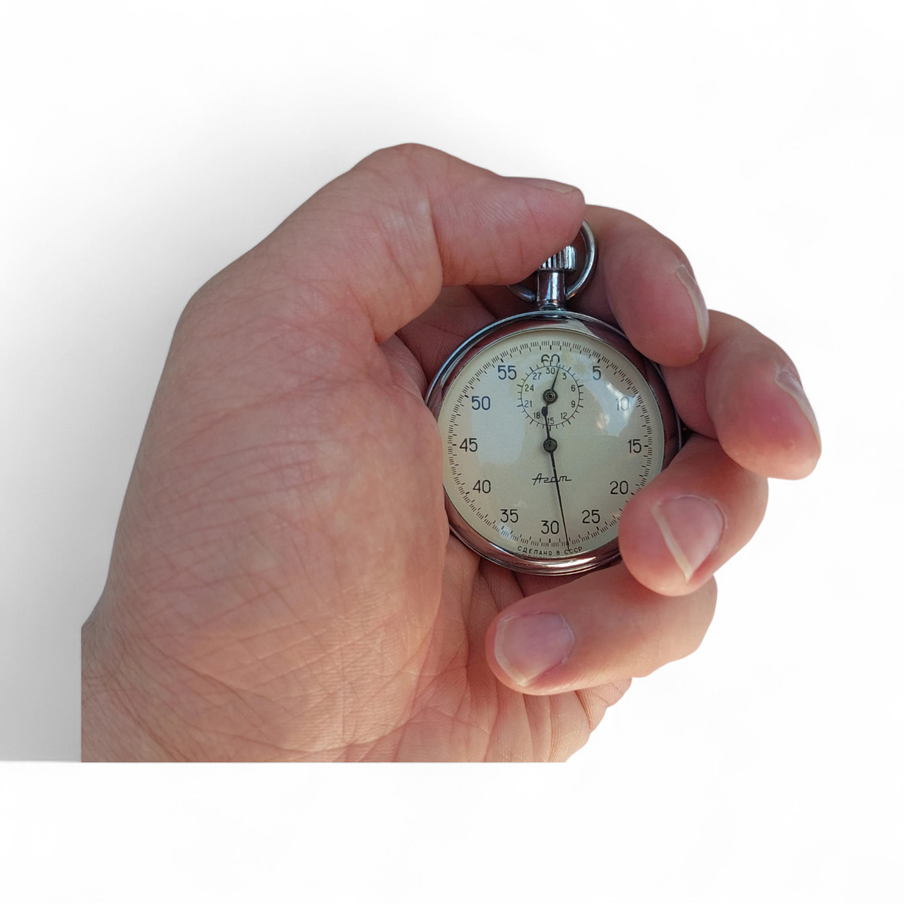 Vintage AGAT mechanical stopwatch, manufactured in the 1970s in the former Soviet Union by the Agat watch factory in Zlatoust. Model with 15 jewels, manual winding mechanism, and analog display.