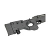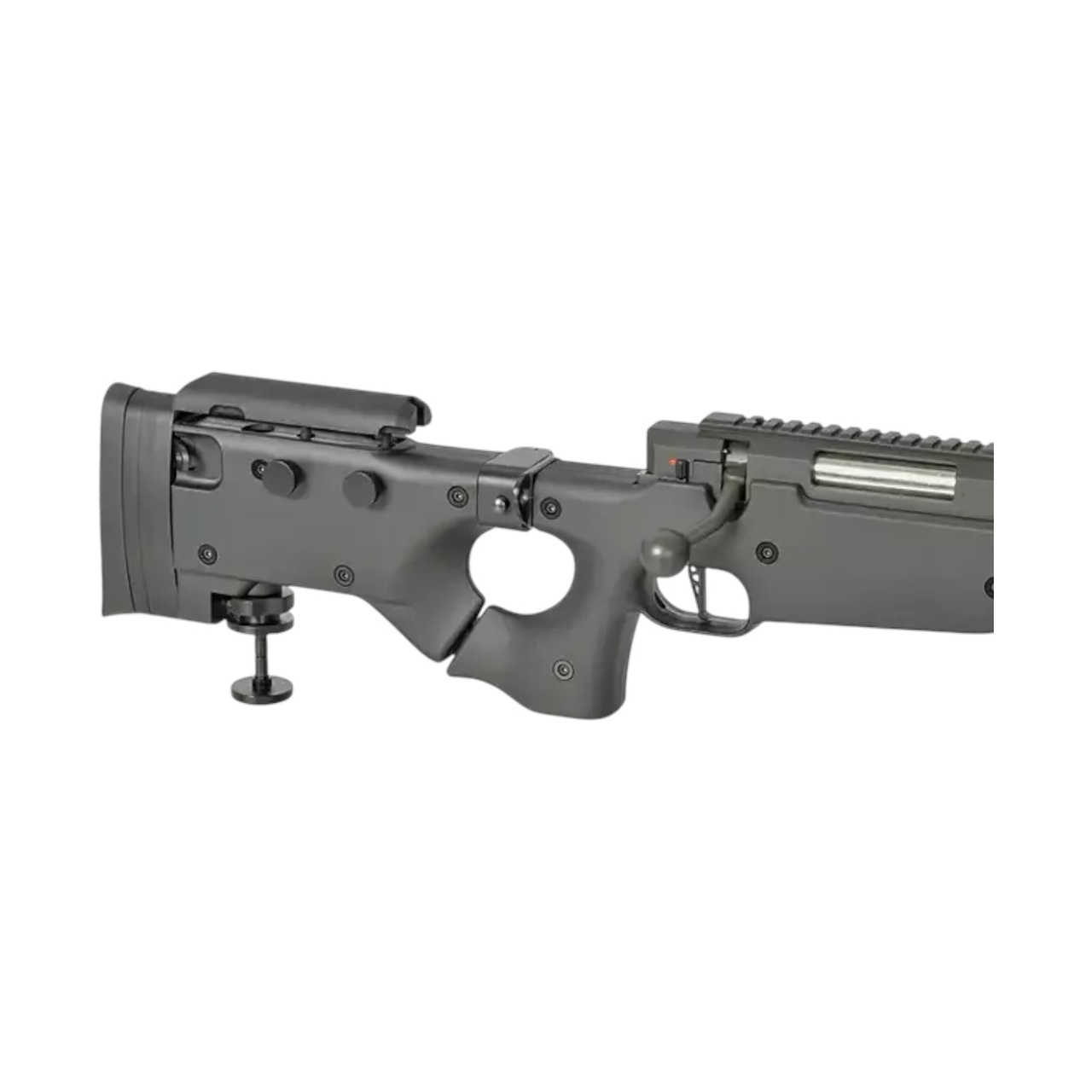 The stock is made of reinforced polymer, similar to the material used in the real weapon, and is equipped with sling and bipod attachment points. Weighing approximately 3.8 kg, the replica is well balanced and comfortable for extended use thanks to the AWM thumbhole grip. The adjustable and folding stock allows for ergonomic adjustments (length and height of the monopod) and facilitates transport in cases.