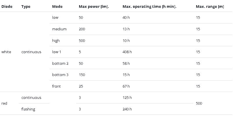 • 6 omnidirectional lighting modes, 3 low-light modes, 1 standard omnidirectional mode
