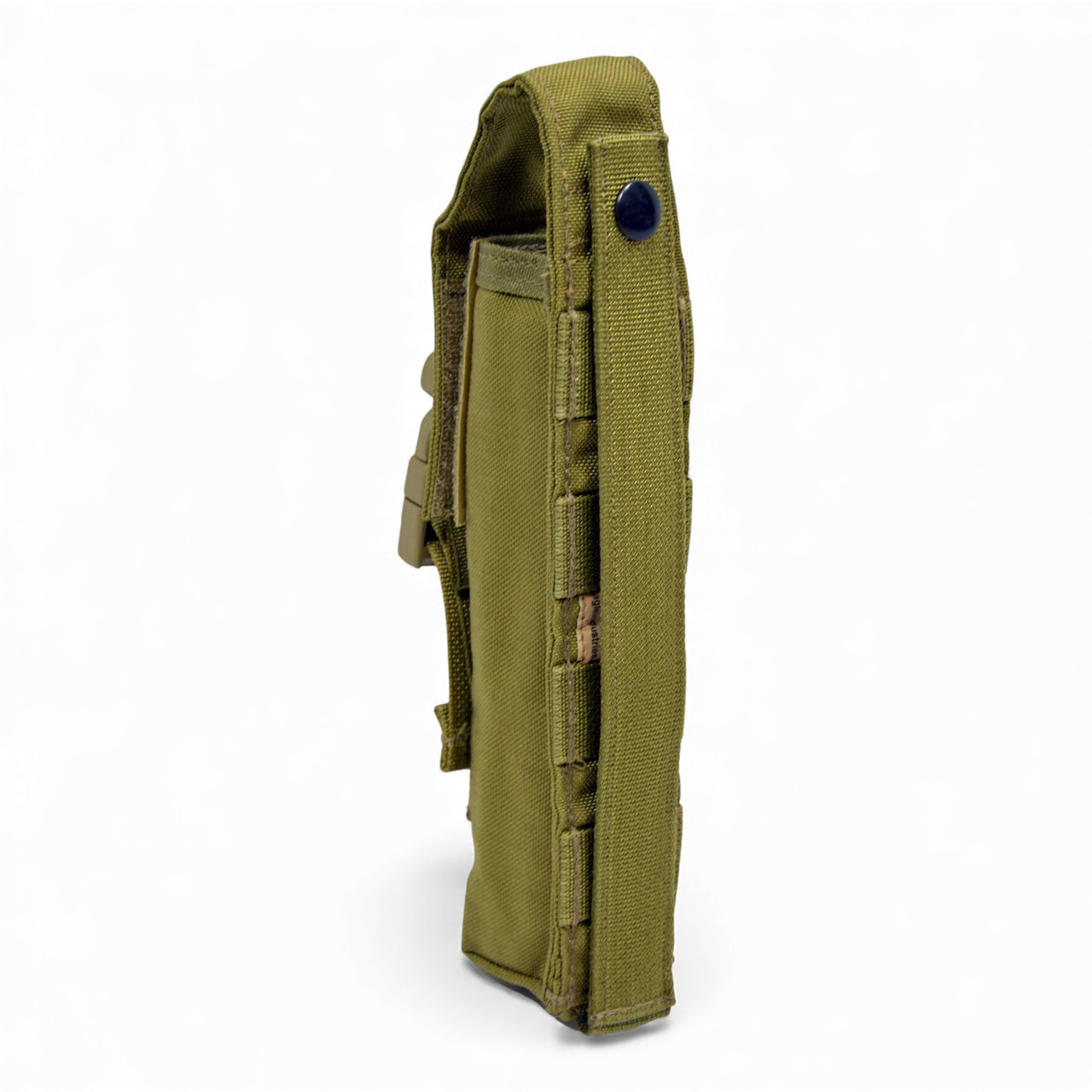 Equipped with a top flap that can be closed either with a hook-and-loop fastener or an adjustable buckle, the pouch provides double security and quick access when needed. On the back, it features one MOLLE strap with a metal snap and four MOLLE loops, allowing versatile attachment to tactical vests, backpacks, or other modular systems.