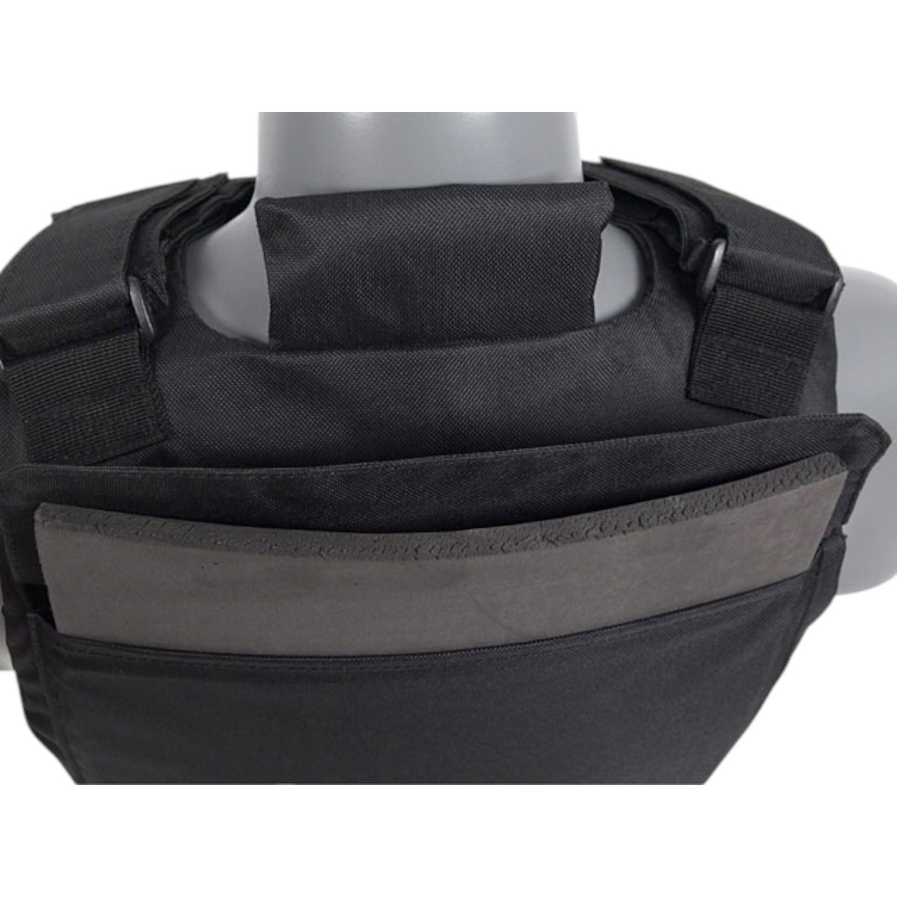 On the front, the vest features a large Velcro panel for attaching ID patches and other accessories. The back of the vest includes special neck protection. The package includes soft dummy ballistic inserts (non-functional).