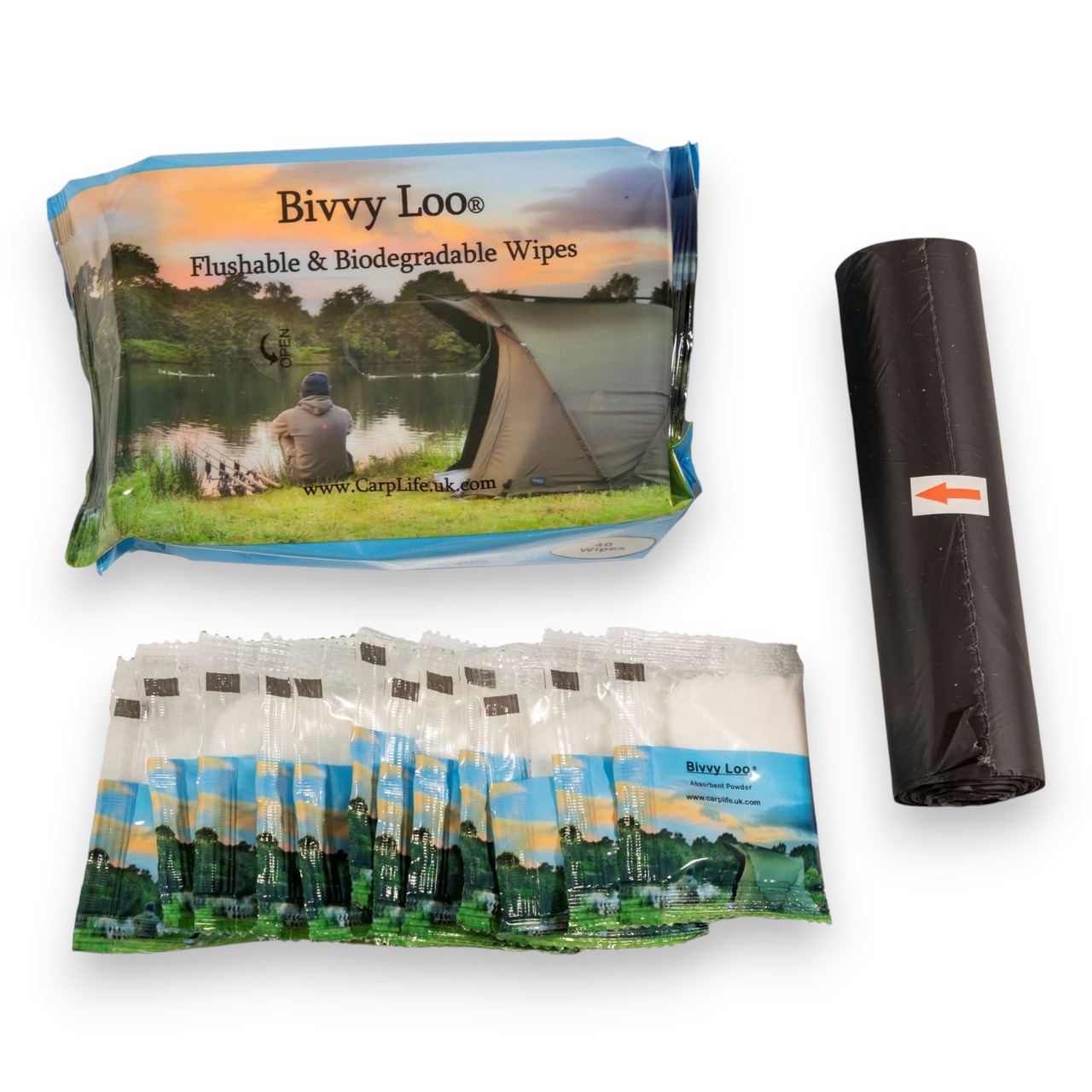 An additional pack containing 40 biodegradable wipes, 12 compostable and biodegradable liner bags, as well as 12 absorbent powder sachets for waste management.