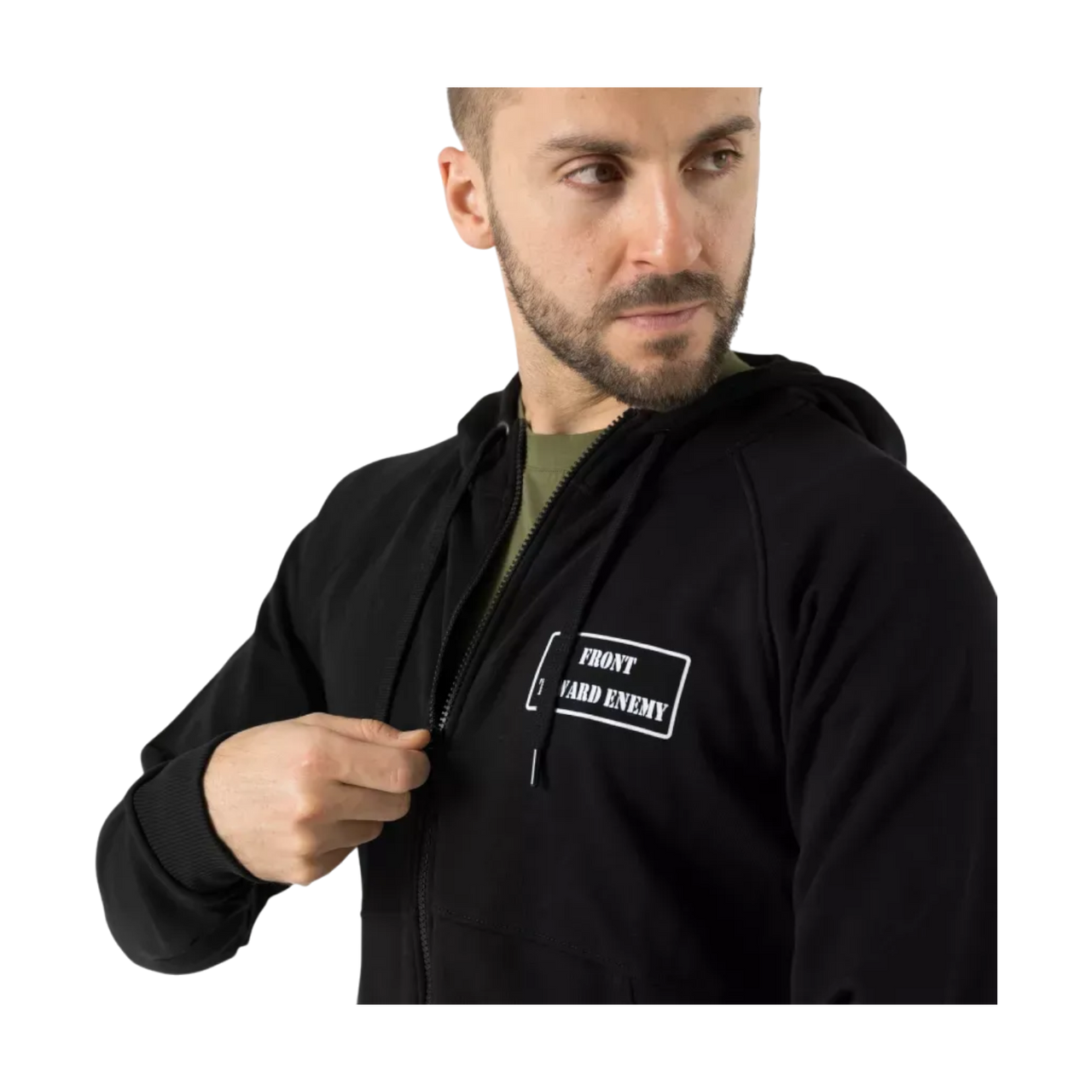 The Front Toward Enemy hoodie is the perfect choice for those who want an urban style with personality and tactical influences. Lightweight and comfortable, this full-zip model is ideal for everyday wear, offering freedom of movement and a modern look.