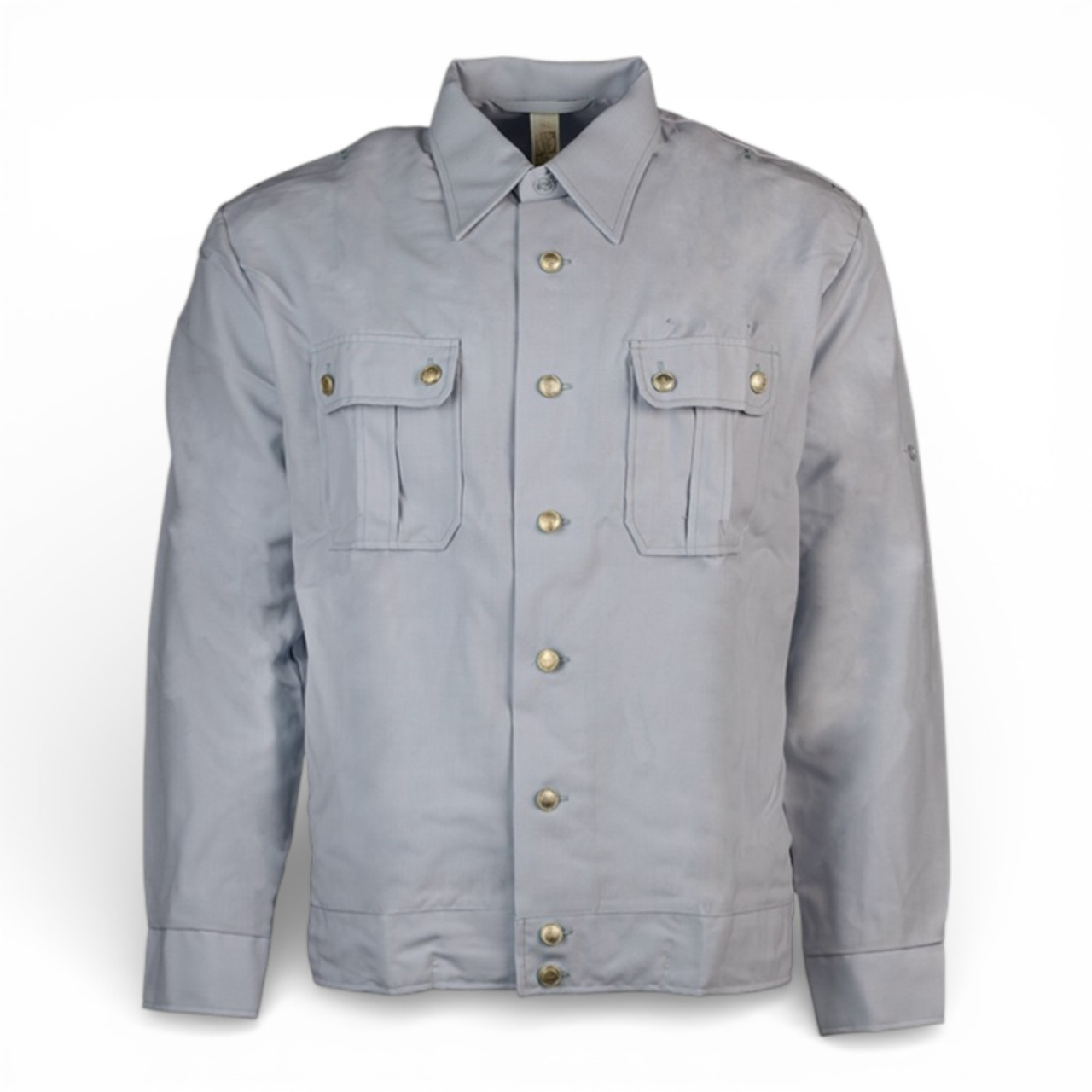 A very rare service shirt, the everyday model used by the East German Navy (Volksmarine der NVA). It is made from a cotton-polyester blend and features two pleated chest pockets with double buttons, epaulette loops, and brass buttons typical of naval uniforms.