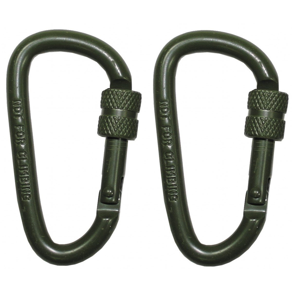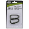 Két D alakú karabinerből álló szett, könnyű alumíniumból. A zárókar biztonsági csavarja megakadályozza a karabiner véletlen kinyílását. Ezekkel a karabinerekkel gyorsan és egyszerűen felszerelhetők kisebb felszerelési elemek vagy kiegészítők, például kulcsok, zseblámpák, kesztyűk vagy más szükséges tárgyak.
