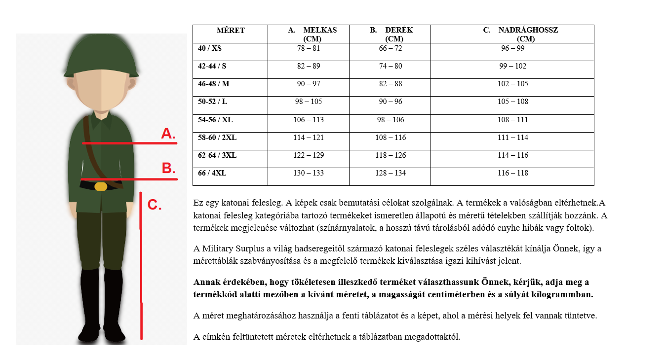 A katonai felesleg kategóriába tartozó termékeket olyan tételekben szállítják hozzánk, amelyek állapotát nem ismerjük. A termékek megjelenése változhat (színárnyalatok, kisebb hibák vagy a hosszú távú tárolásból eredő nyomok).