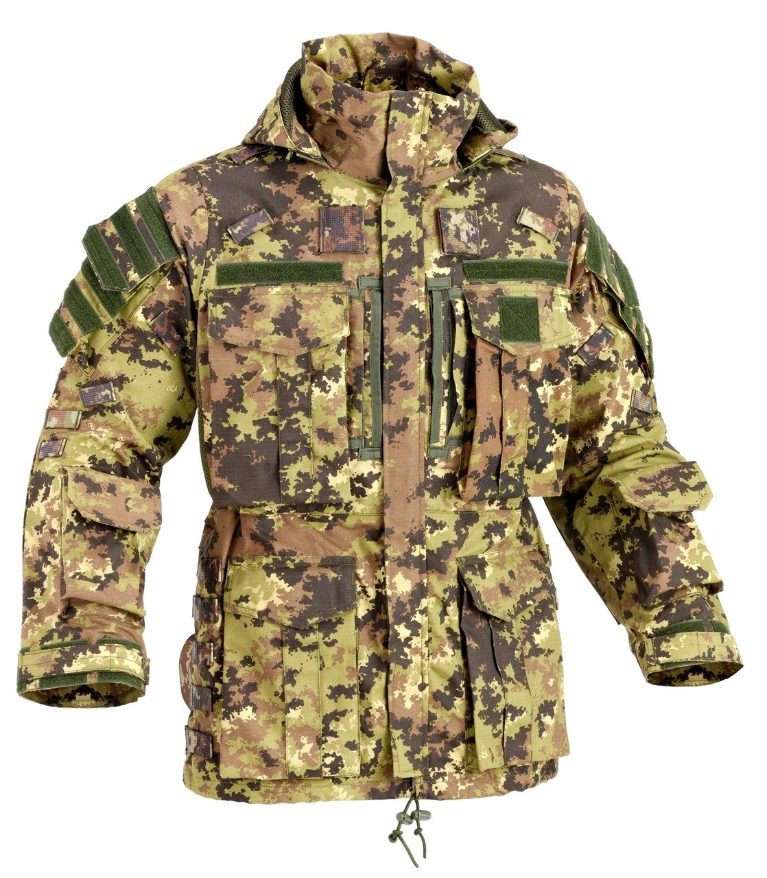 SNIPER JACKET: Két tépőzáras felső és alsó zsebbel rendelkezik. A cipzárral a kezelő hozzáférhet a kabát belsejéhez. A billentyűzet rejtett zseb tépőzáras zárral. Dupla cipzár vízzáró párnával a teljes vízvédelem érdekében. A taktikai kabát hidratáló nyílással van ellátva. Az elülső oldalon MOLLE fogantyúk, fogópontok és hevederek vannak ellátva az azonosító zsebek, a gerinc stb. Számára. A kezelő három, többcélú táskát csatlakoztathat palackok, rádiók stb. Tárolásához. A hátsó kabát MOLLE szalagokkal és megfogási pontokkal van ellátva. A teljesen rejtett levehető motorháztetőnek van egy félmerev keresője. A víz alatti szellőzőnyílások felszabadítják az operátora által nyújtott izzadságot és nedvességet fizikai intenzitásának ideje alatt. A tömlők különféle MOLLE szálakkal vannak ellátva. Két taktikai zseb van mindegyik hüvely tetején és alján. A hüvely felső zsebének különböző tépőzáras szalagjai vannak bármilyen típusú tapaszhoz. Keményített könyökvédőkkel, állítható csuklópántokkal és rugalmas belső kábellel rendelkezik, hogy hozzáférhessen a hüvelykujjához. A kabát belsejében egy derék két cipzáras zsebbel.