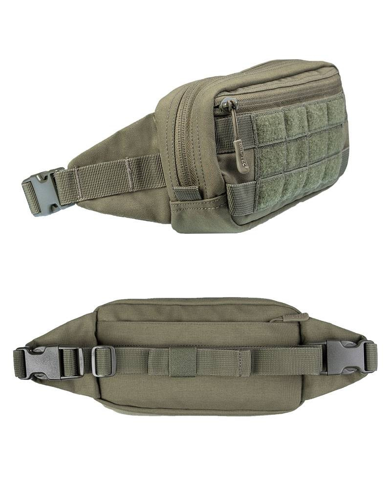 - Kicsi és kompakt csípőtáska molle hurokkal az elülső zsebben