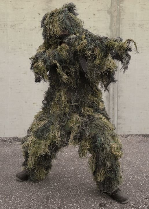 A "Ghillie" álcaruha a következőkből áll: nadrág, kabát, fejrész és egy további álcázó elem, amely a fegyver álcázására használható.