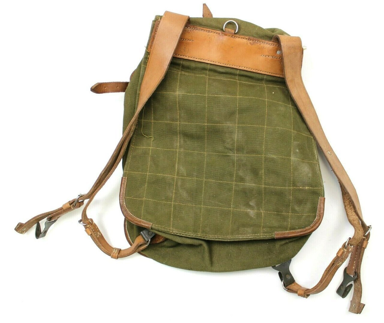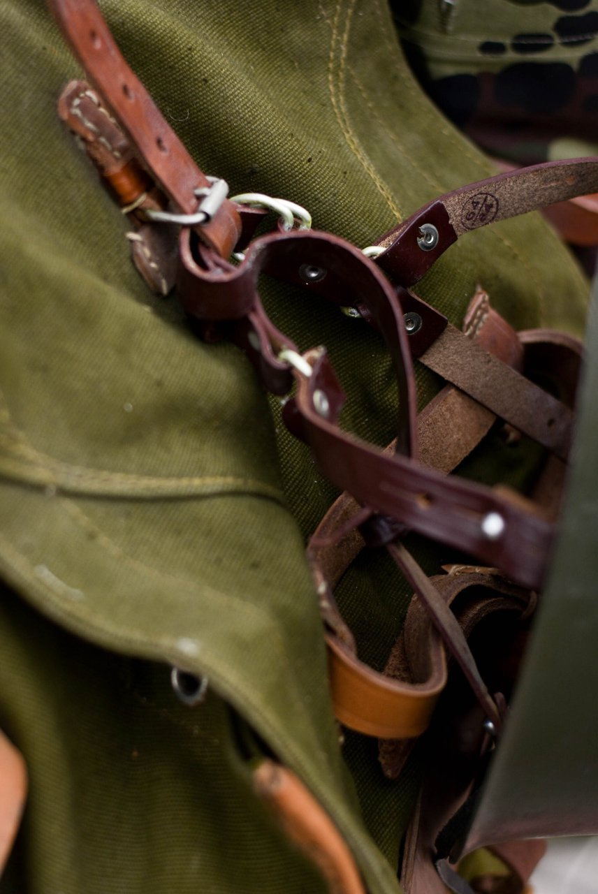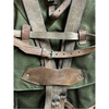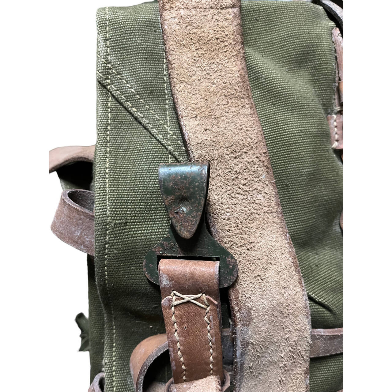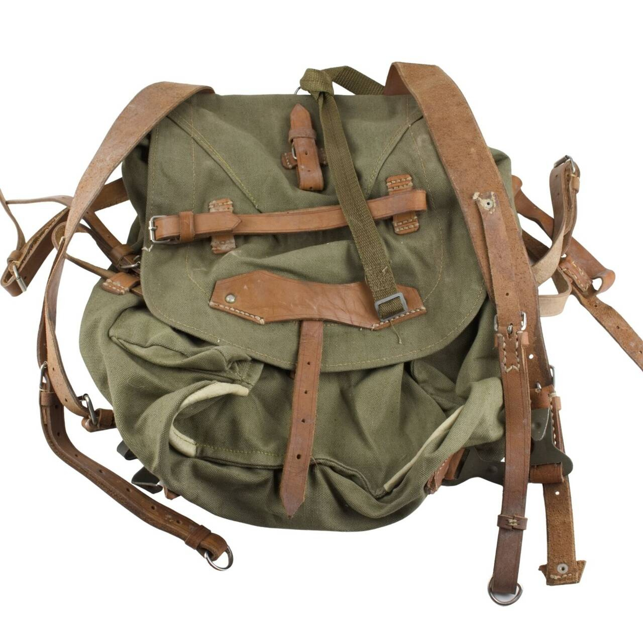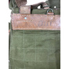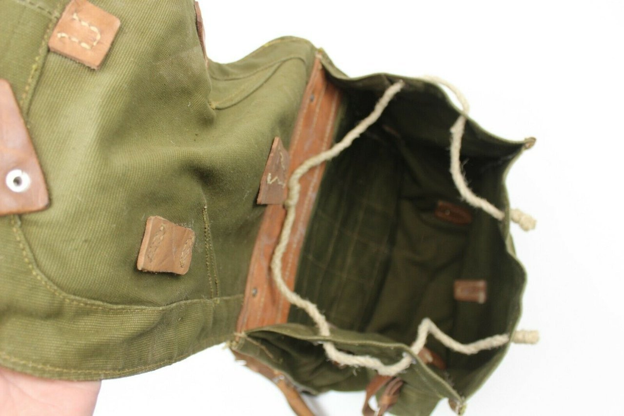 Ez a valódi, nem használt katonai hátizsák erős, strapabíró vászonból készült, hadseregzöld árnyalatban. A bőr vállpántok állíthatóak és szélesebbek a vállon a kényelmes viselet érdekében. A táska elég nagy, és sok mindent elfér benne, van rajta egy bőrszíj és egy szövetzseb is az egyik oldalán, ahol például egy nagy vizes palackot, egy állványt vagy egy papírtároló csövet tudsz szállítani. Belülről zsinórral záródik, kívülről pedig fémcsattal ellátott bőrszíjjal rögzíthető. Mindenhol sok kis bőrhurokkal van ellátva, ezekre a hurkokra a katonai felszereléseket, mint például a sisakot és a sátrat rögzítették.