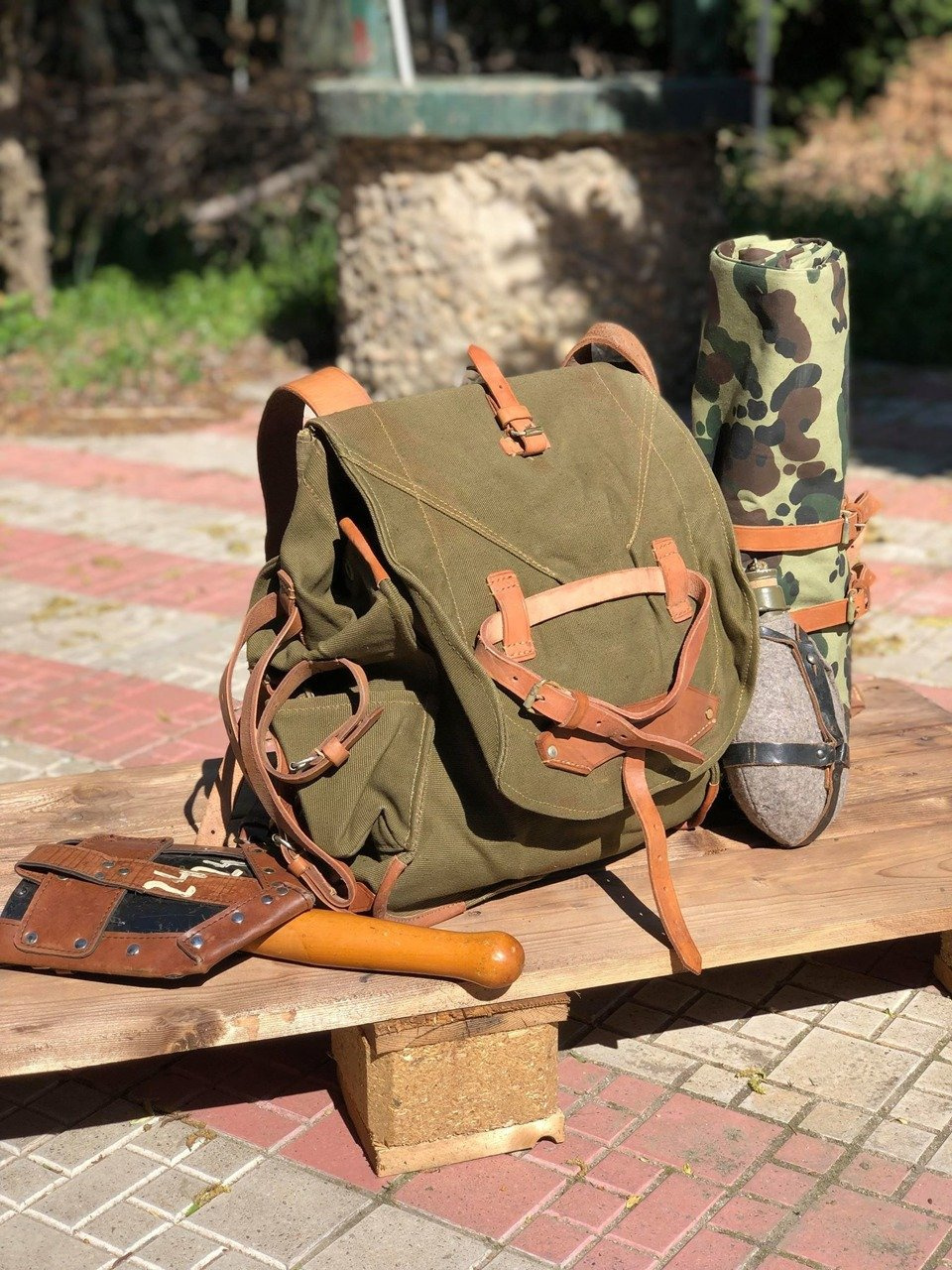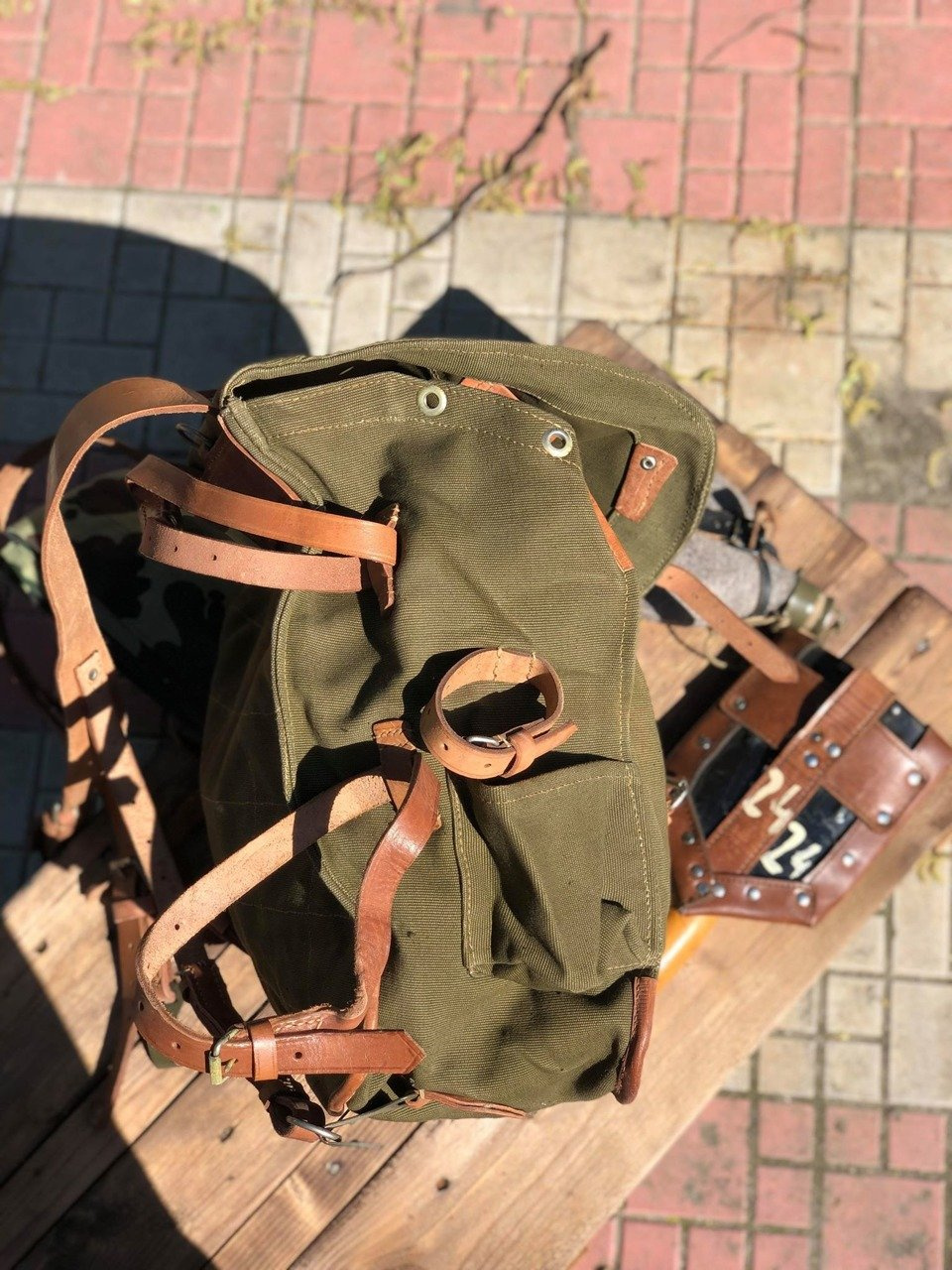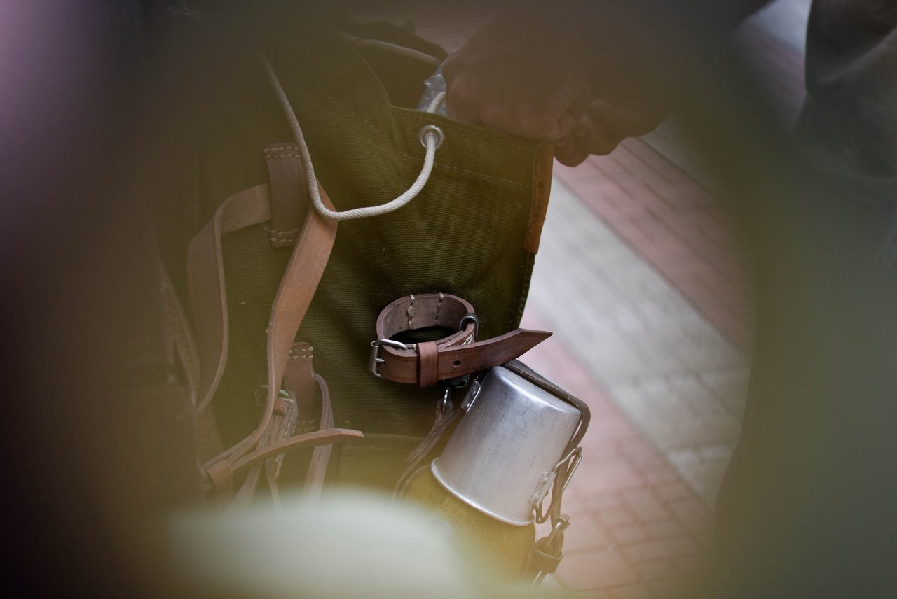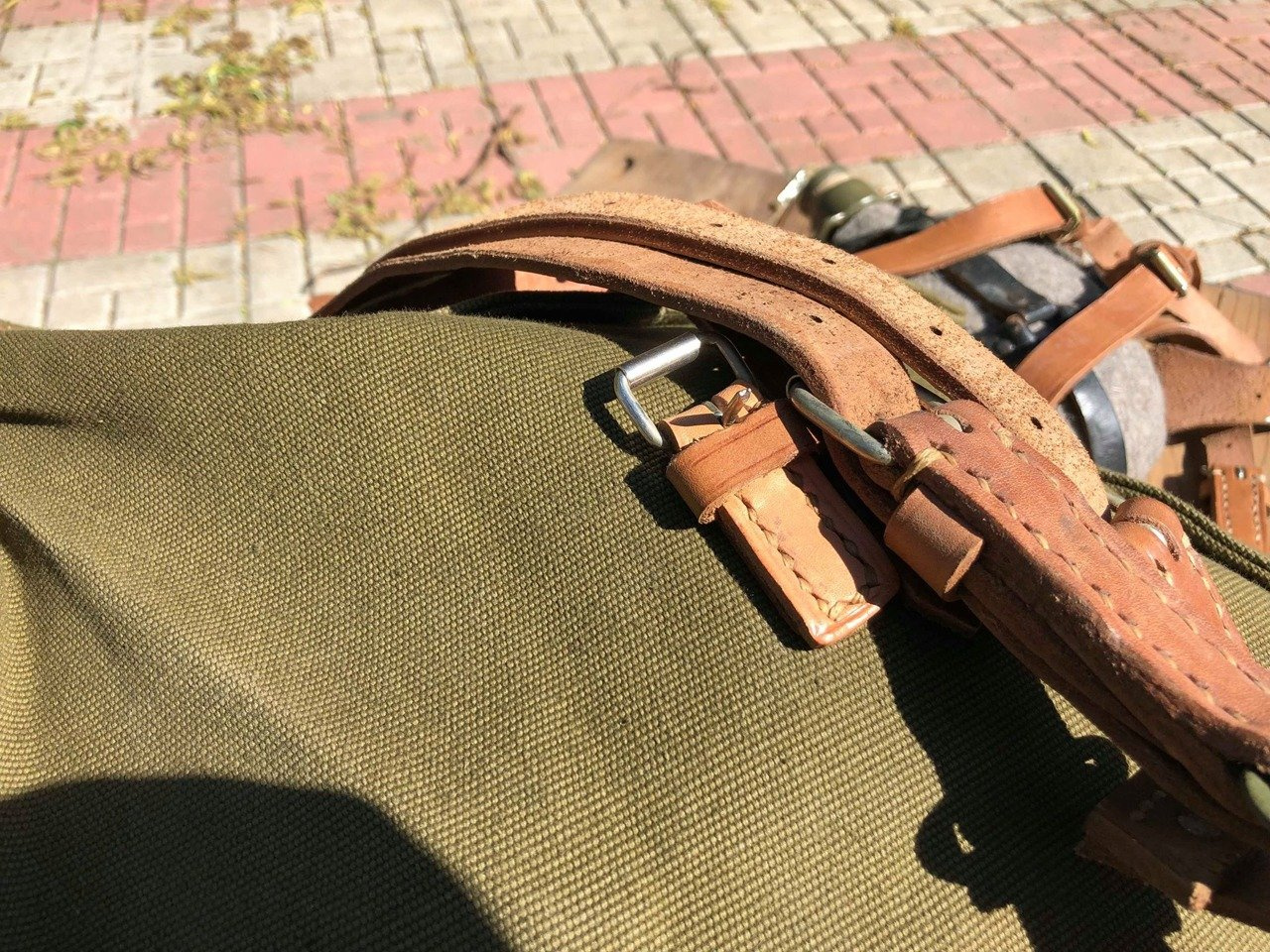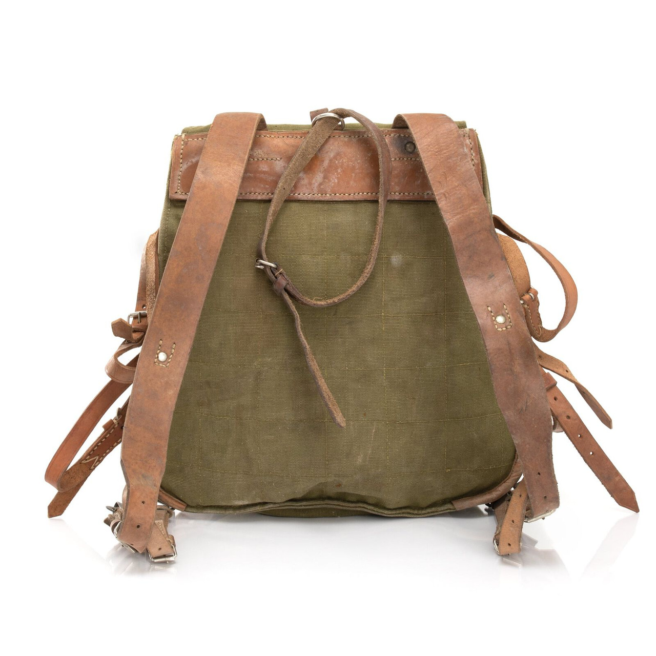 Ez a valódi, nem használt katonai hátizsák erős, strapabíró vászonból készült, hadseregzöld árnyalatban. A bőr vállpántok állíthatóak és szélesebbek a vállon a kényelmes viselet érdekében. A táska elég nagy, és sok mindent elfér benne, van rajta egy bőrszíj és egy szövetzseb is az egyik oldalán, ahol például egy nagy vizes palackot, egy állványt vagy egy papírtároló csövet tudsz szállítani. Belülről zsinórral záródik, kívülről pedig fémcsattal ellátott bőrszíjjal rögzíthető. Mindenhol sok kis bőrhurokkal van ellátva, ezekre a hurkokra a katonai felszereléseket, mint például a sisakot és a sátrat rögzítették.