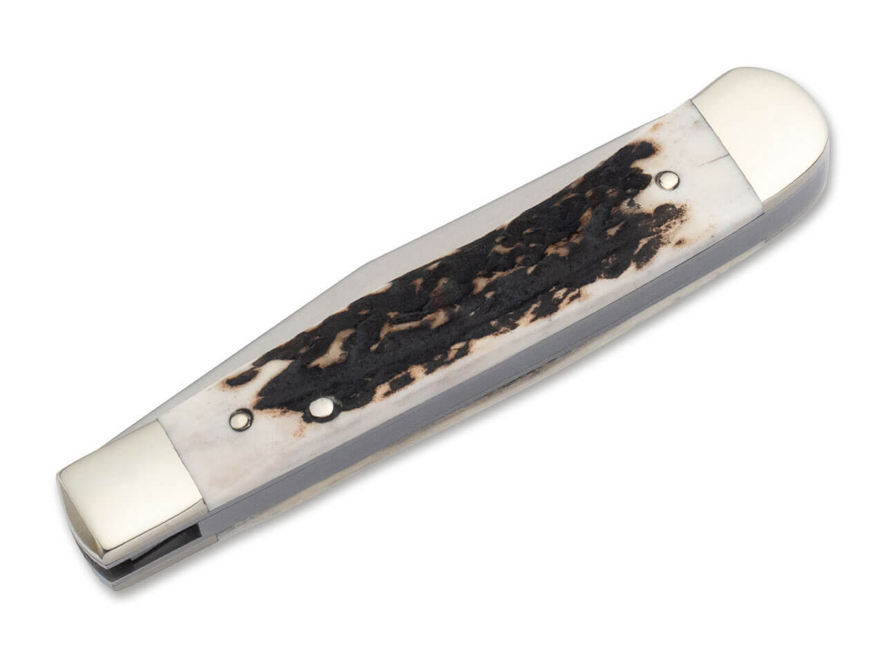 A klasszikus Boker Trapperliner egyesíti az amerikai vadőrök által már használt trapper dizájnt egy modern linerlockkal. A kézzel válogatott szarvas szarvaspikkelyek és a karcsú nikkelezett ezüst csavarok adnak otthont a polírozott, jéggel edzett 4034 rozsdamentes acélból készült pengének, amely mindkét kézzel nyílik az egymásba nyíló szögbevágáson keresztül. Karcsú és elegáns zsebkés minden alkalomra. Kiváló minőségű filc tasakkal érkezik a tároláshoz. Kézzel készült a Boker Solingeni késgyárában.