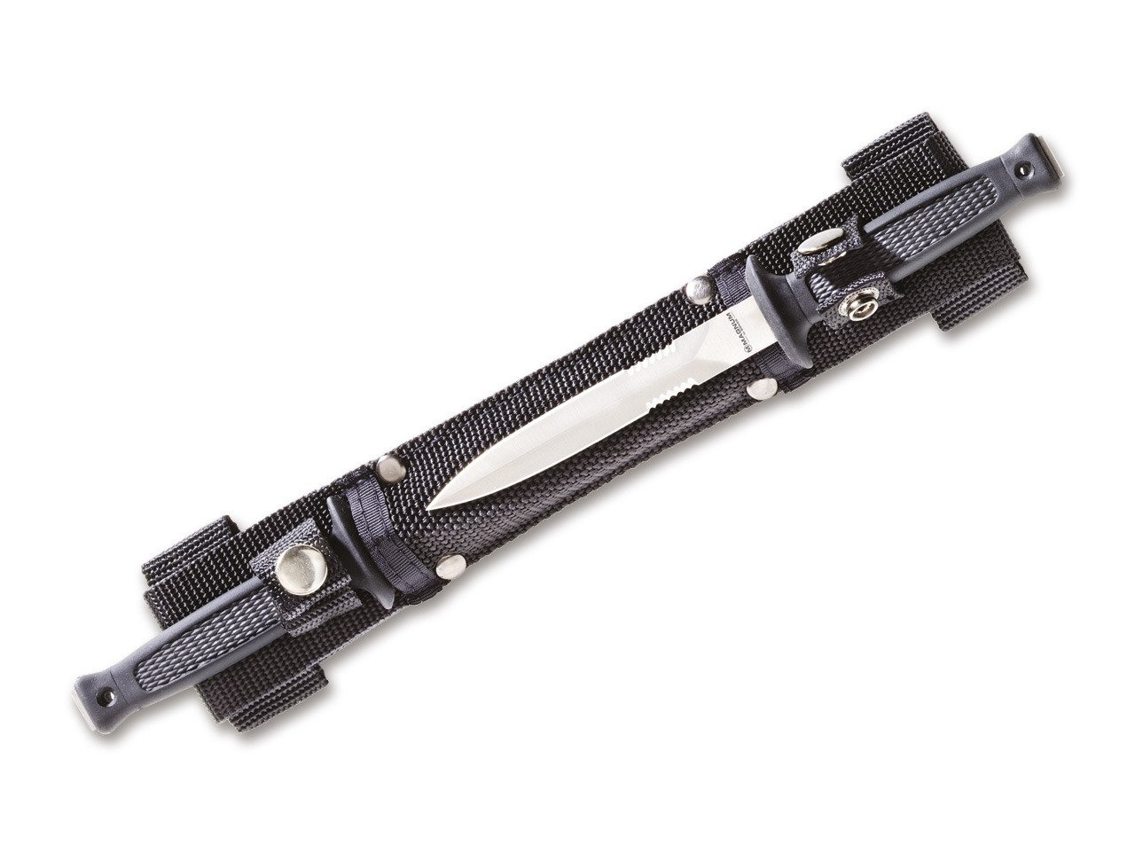 A Magnum Doublette késkészlet könnyen hordható vízszintesen az övön. A 10 centiméter hosszú 420-as tőr pengék mindkét oldalon részlegesen fogazottak, és biztonságosan illeszkednek a nylon tokba. A műanyag elasztomerből készült markolat garantálja a legjobb kezelhetőséget még rossz időjárási körülmények között is.