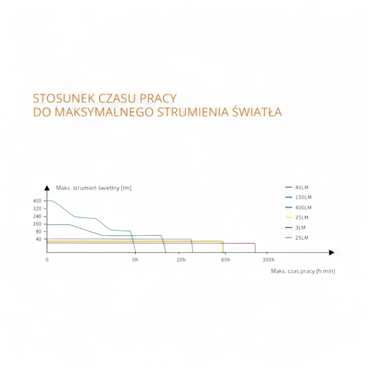 A zseblámpa fehér és piros fényt biztosít. A fehér fény maximális fényereje 400 lumen, ebben a módban akár 5 óráig is működik. A következő módok is rendelkezésre állnak: közepes (150 lumen), alacsony (40 lumen), gyenge fény 1 (3 lumen), gyenge fény 2 (25 lumen) és irányított elülső fény (25 lumen). A vörös fény két módban működik: folyamatos (1 lumen) és villogó (1 lumen). A vörös fény hullámhossza (622-720 nm) 500 méteres távolságból is láthatóvá teszi.