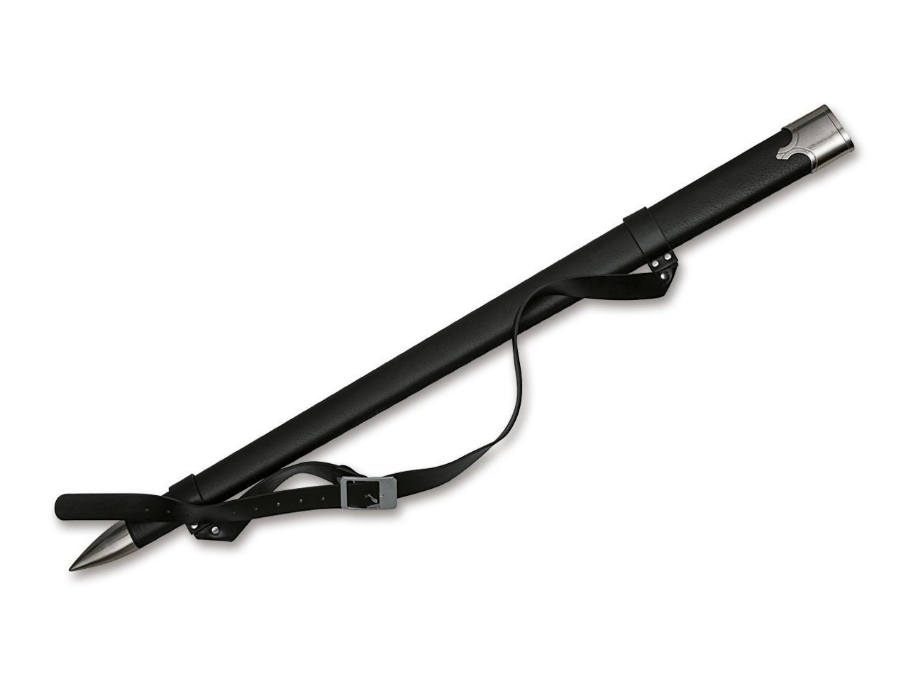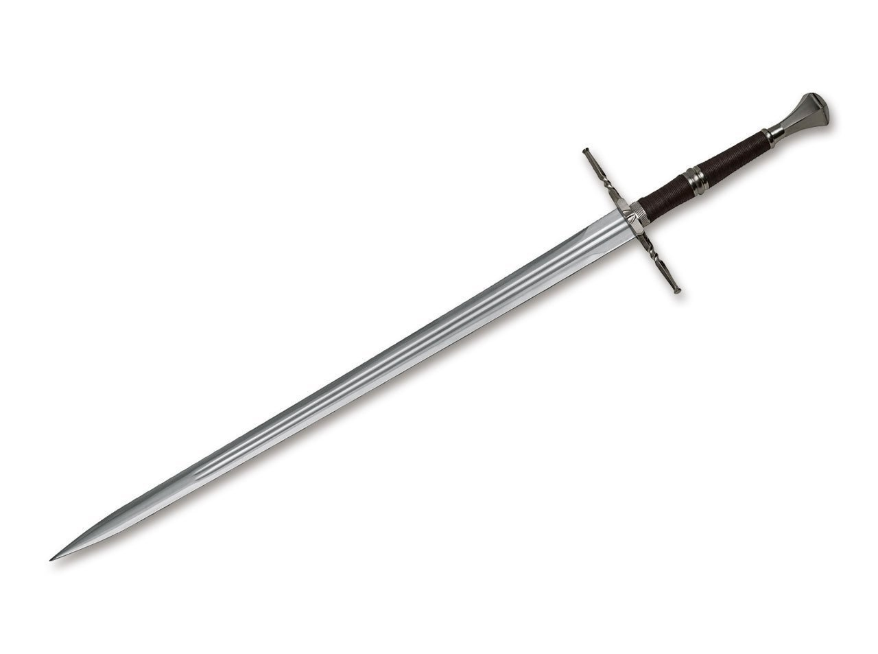 The huge Magnum Ferrum is an impressive two-handed sword that is used by its owner especially against human opponents. The medieval sword is made of high-quality stainless steel, the handle is wrapped with thin rope. The ornamentally decorated crossguard protects against attacking villains, and the massive pommel can also be used skilfully. Thanks to the precisely fitting scabbard with adjustable strap the sword can be carried comfortably on the back.