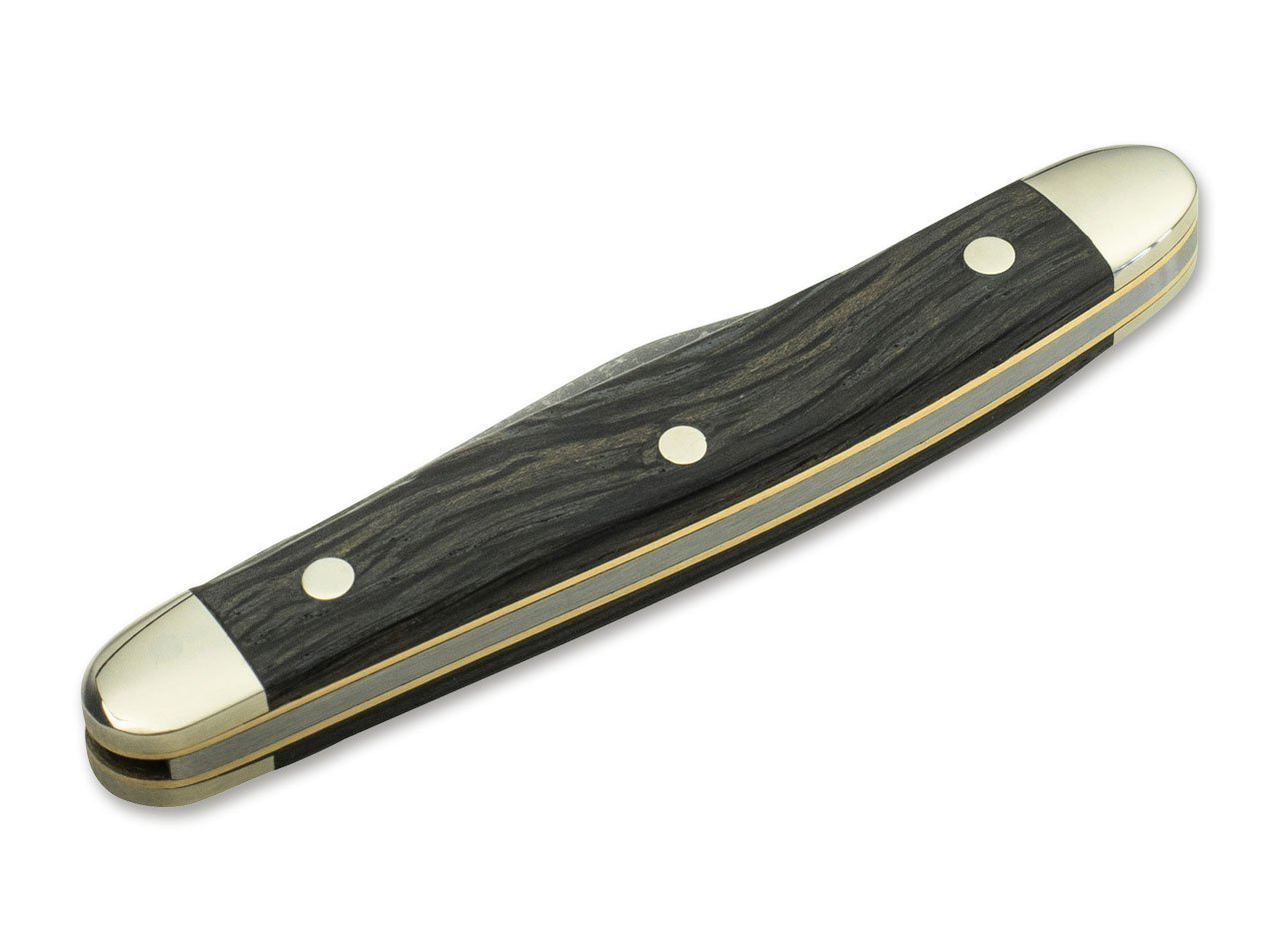 This version of the classic Boker Pen Knife is equipped with a blade made of non-stainless C75 with a dark acid-wash finish, which can be opened with two hands by nail nick. The fine blade of this extremely handy pocket-knife was formerly used to prepare the keels of large bird feathers for writing and drawing and owes its name to this application. The high-quality handle scales are made of dark bog oak wood and thus form a beautiful contrast to the elegant nickel silver bolsters. Handmade in the Boker Knife Manufactory Solingen.