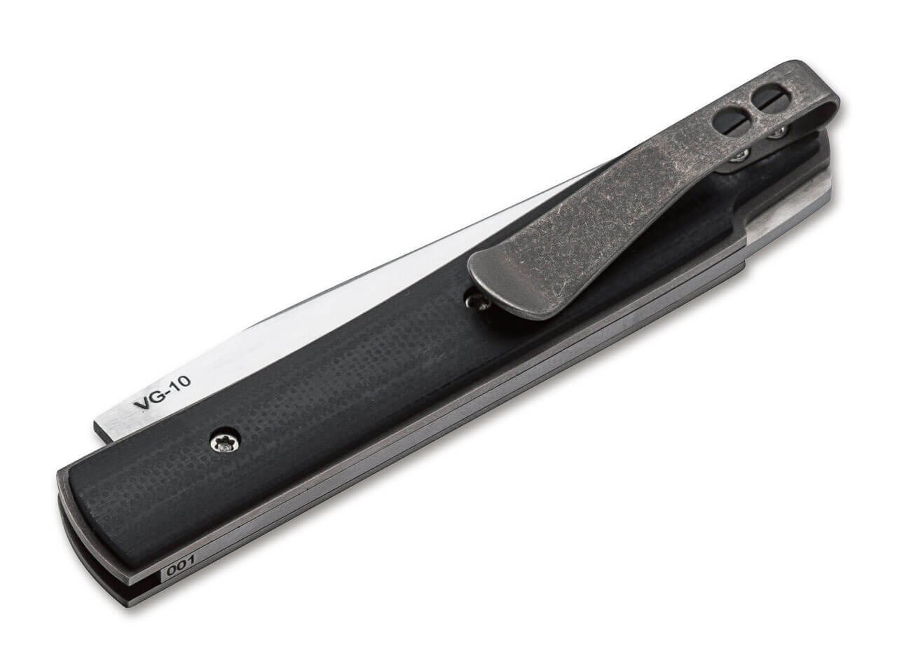 A Boker Plus Urban Trapper legkisebb változata, Brad Zinker, mostantól további zárszerkezettel kapható az új szabadalmaztatott drótfogas hátsó zárnak köszönhetően. A helytakarékos drótfogas miatt már nincs szükség további felső rugóra, ami jelentősen több helyet biztosít a pengének a fogantyúban. A VG-10-ből készült, finom hajvonalú penge körömbevonattal rendelkezik a kétkezes működéshez. A válogatott cocobolo fából készült nemes markolatú mérlegek kiemelik ennek a rendkívül könnyű úri késnek a nemes jellegét. Mély hordozható kapoccsal (billenthető / r) és kiváló minőségű nejlon tokkal.