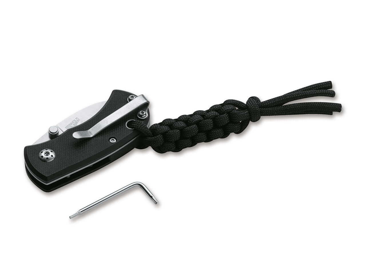 Michael Reinhold rendkívül kompakt Boker Plus Rockhopper praktikus kétujjas késként nyújt meglepetést, kiváló ergonómiával és rendkívül kényelmes kézpozícióval, amelyet a fekete zsinór tovább javít. Rövid, D2-ből készült pengével van felszerelve, amelyet mindkét oldalon eltávolítható hüvelycsap nyit és a texturált G10 markolatban stabil rozsdamentes acél bélésrögzítő rögzít a helyén. A dekoratív penge tengelycsavarja egyértelműen ívelt. Megerősített zsinórlyukkal, mély hordozható kapoccsal (fel-fel / fel) és kiváló minőségű nejlon tokkal a tároláshoz.