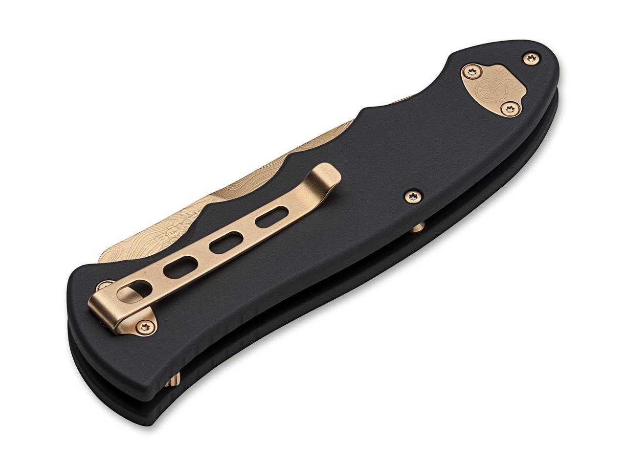 Most, 55 évvel később, megragadjuk a lehetőséget, hogy bemutassuk sikeres Boker Leopard-Damascus III 42-ösünk "aranyozott" változatát, amely az évek során lelkes rajongókat szerzett fegyvercsöves acéljának köszönhetően. A Boker Leopard-Damascus III Gold 42 penge 300 réteg kézi kovácsolású, kizárólag aranyozott Leopard Damaszkuszi acélból áll. Az összes alkatrész, beleértve a penge és a fogantyú csavarjait, a távtartókat, a béléseket, a kapcsot és a kapcsos lemezt is aranyozott. Az újrapozícionálható kapcsok (fel-le / fel-le) kényelmes hordozhatóságot tesznek lehetővé. A pengét 1,5 mm vastag béléssel rögzítik.