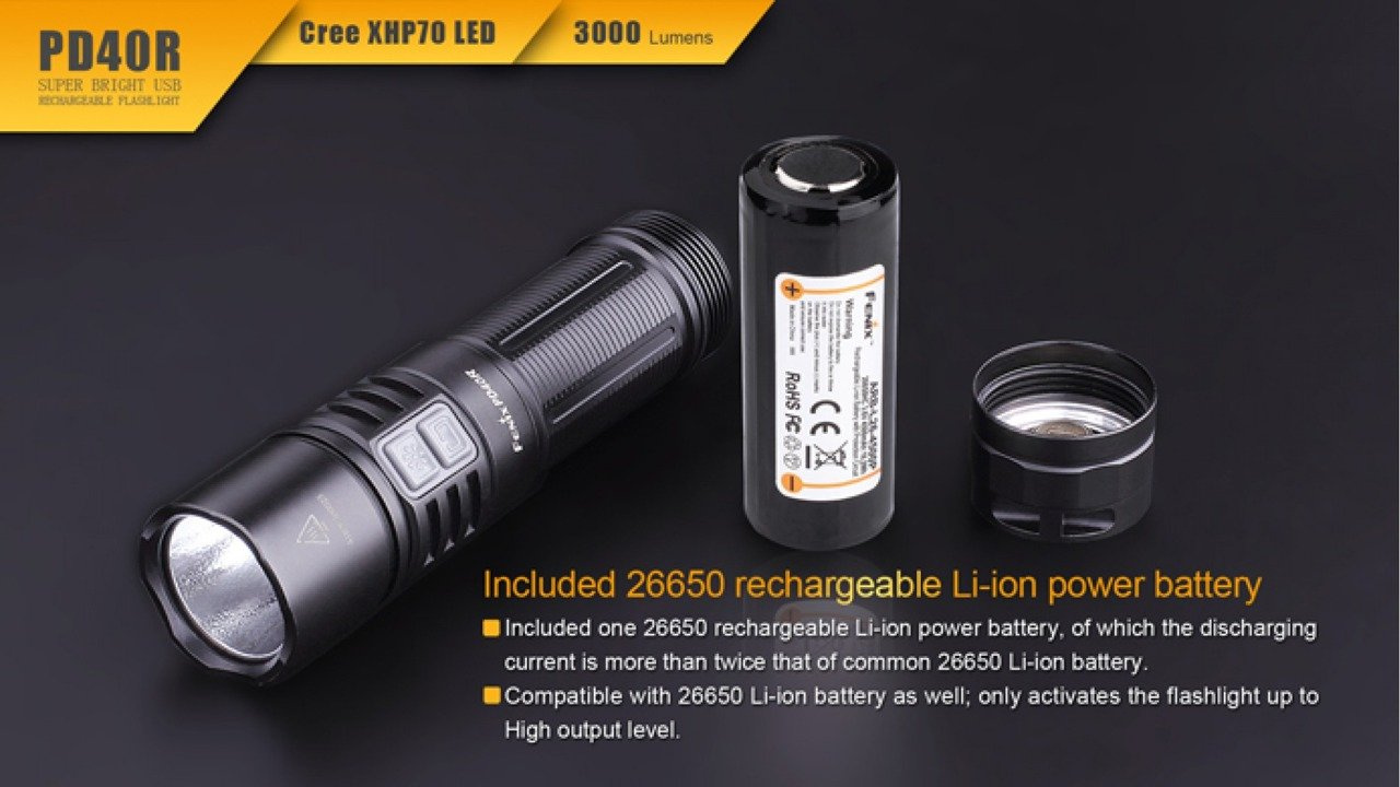A Fenix PD40R rendkívül nagy teljesítményű fény. A nagyon kompakt kialakítás és a speciális nagy teljesítményű akkumulátor együttesen 3000 lumenes turbófeltöltést tesz lehetővé. 4 további fényerő (1000/350/100/20 lumen), valamint strobe és SOS. A rendkívül széles fénykúp lenyűgöző megvilágítási teret biztosít. Az integrált USB töltési funkció lehetővé teszi a speciális akkumulátor (26650 formátum) fényben történő feltöltését a teljesen vízálló, beágyazott mikro-USB porton (IP68) keresztül. Kétoldalas kapcsoló beépített töltéssel és az akkumulátor állapotának kijelzésével. A szállítás nagyfeszültségű 26650-es akkumulátort, tokot, töltőkábelt, kézi hevedert és póttömítést tartalmaz. A PD40R normál 26650-es akkumulátorral is működtethető, de csak 1000 lumennél. Átmérő: 34 mm (pont) / 30 mm (test).