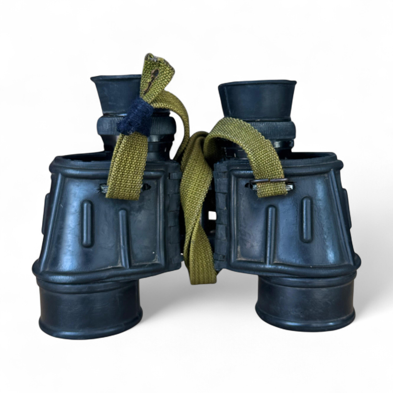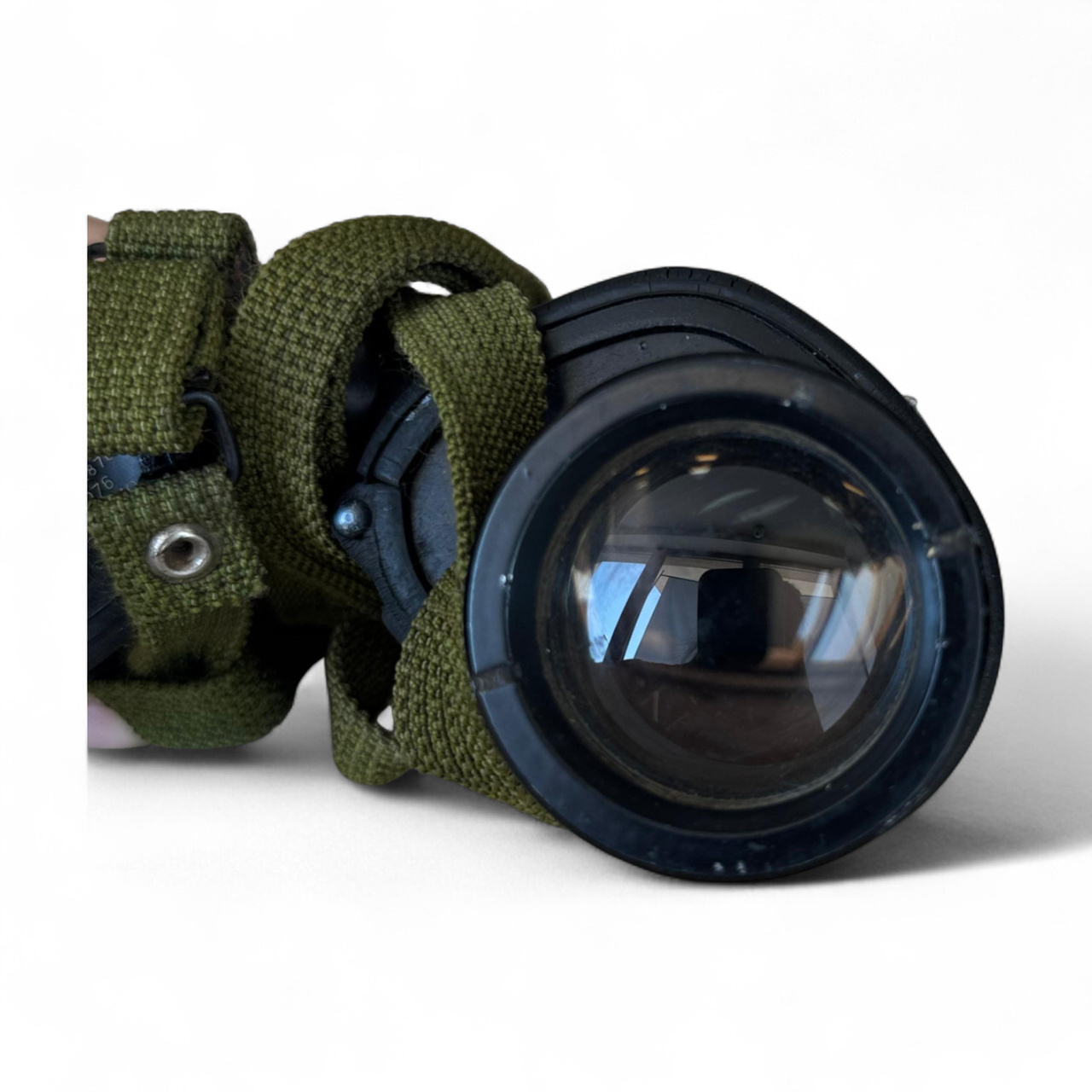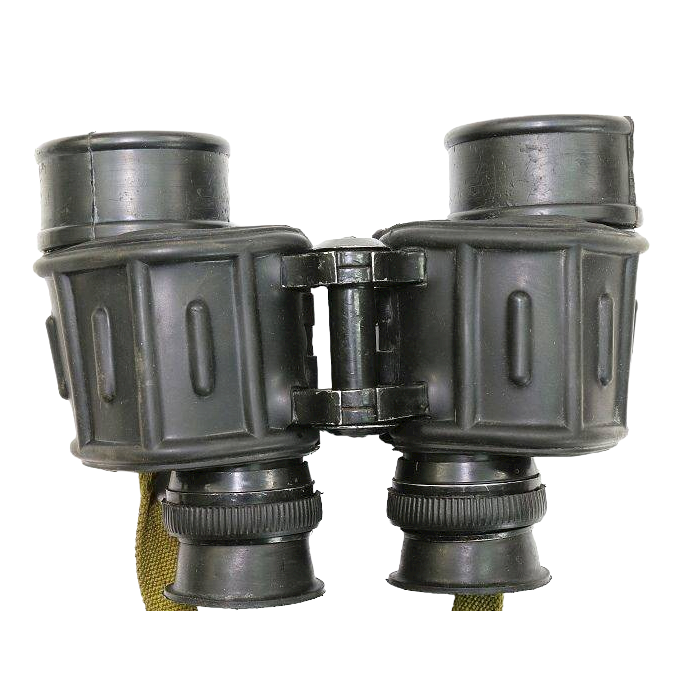 Ez a katonai távcső egyértelműen intenzív használat nyomait viseli, mivel régi, de látszólag működőképes berendezésről van szó. A külső gumiborítás kopott, egyes részein a festék lepattogzott vagy mattá vált, és néhány széle elkopott. A lencséken por és szennyeződés nyomai láthatók, ami részben ronthatja a kép élességét, ha nem tisztítják meg megfelelően.