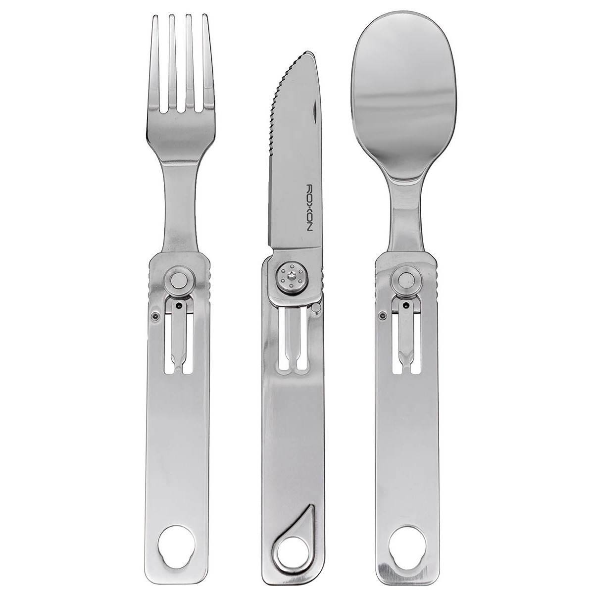 A Roxon® kiváló minőségű, összecsukható, 3 darabos evőeszközkészlet kanállal, villával, késsel és hordtáskával, amely könnyű és kompakt, ideális kiegészítő minden szabadtéri kalandhoz.