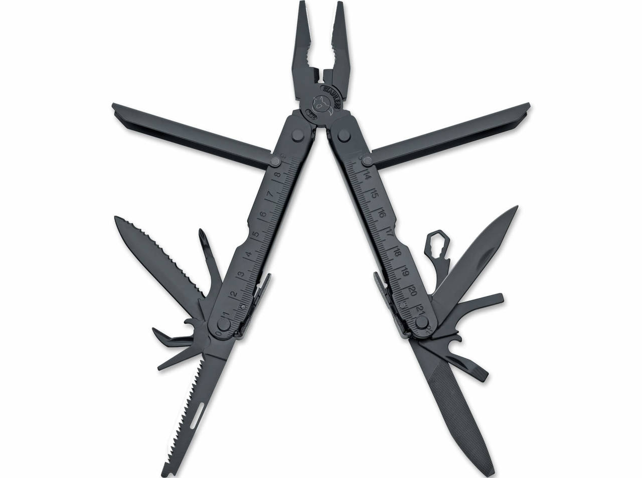 Kiváló minőségű multifunkciós szerszám a BlackFox® gyártótól, klasszikus kialakítással. A szerszám a következő funkciókkal rendelkezik: patent drótvágóval, sima penge, fogazott penge, keresztcsavarhúzó, 2 x lapos csavarhúzó, többkulcsos kulcs, fűrész, reszelő, üvegnyitó, konzervnyitó és lyukasztó. A penge és a szerszámok reteszelő rendszerrel rendelkeznek. Egy nejlon övtáskával érkezik.