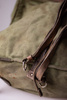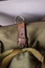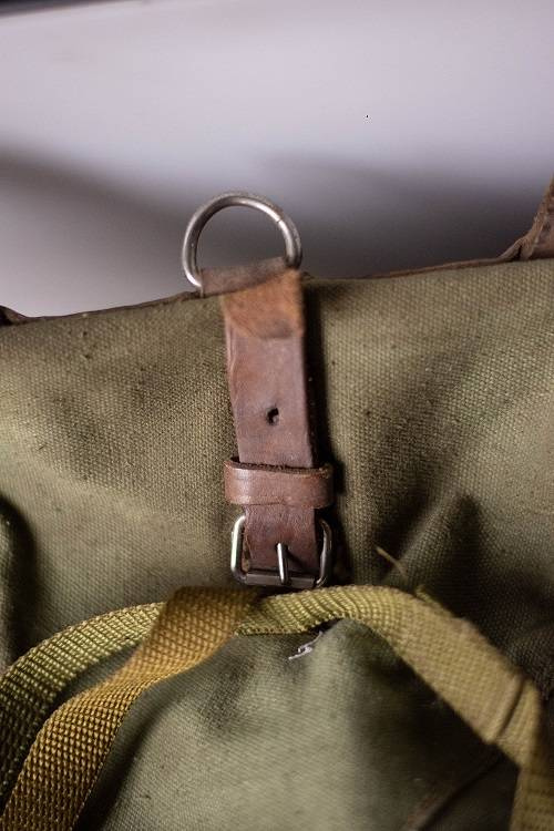 Ez a szinte új katonai hátizsák erős, zöld vászonból készült. A bőr vállpántok hosszúsága állítható, egy sokkal kényelmesebb viseletért. A táska mérete elég nagy, sok dolgot lehet tárolni benne. Az egyik oldalán található egy bőr pánt illetve egy zseb, melyben elfér egy nagy vizes palack, állvány, vagy papír tároló cső. Belülről zsinórral záródik, és kívülről fémcsattal ellátott bőrpánttal rögzíti. Nagyon sok kicsi bőrhurok van rajta, ezen a hurkon a katonai felszerelést, például a sisakot és a sátrat rögzítették.