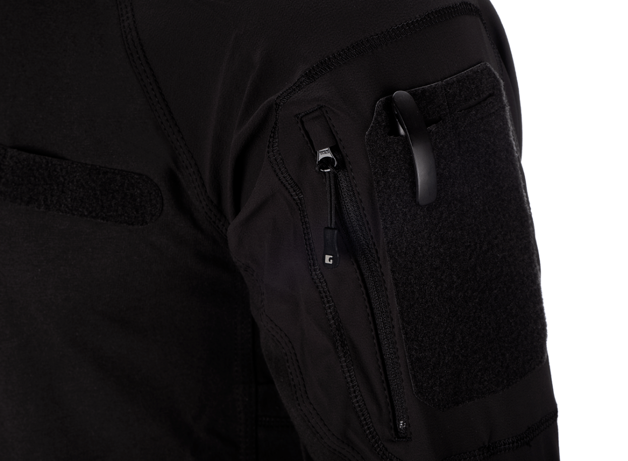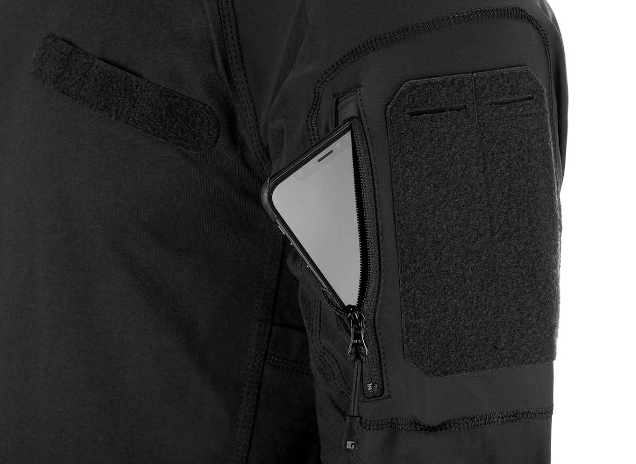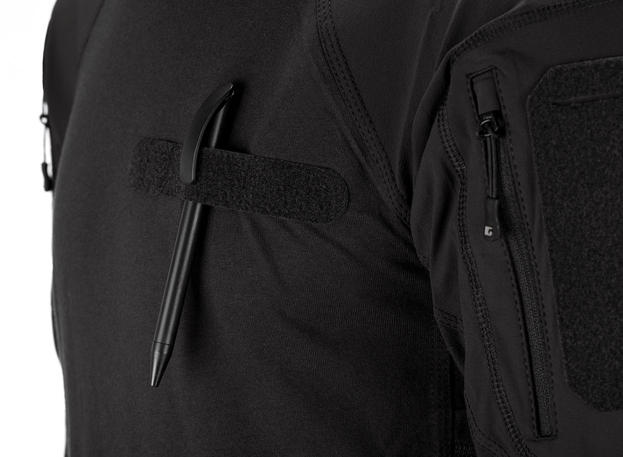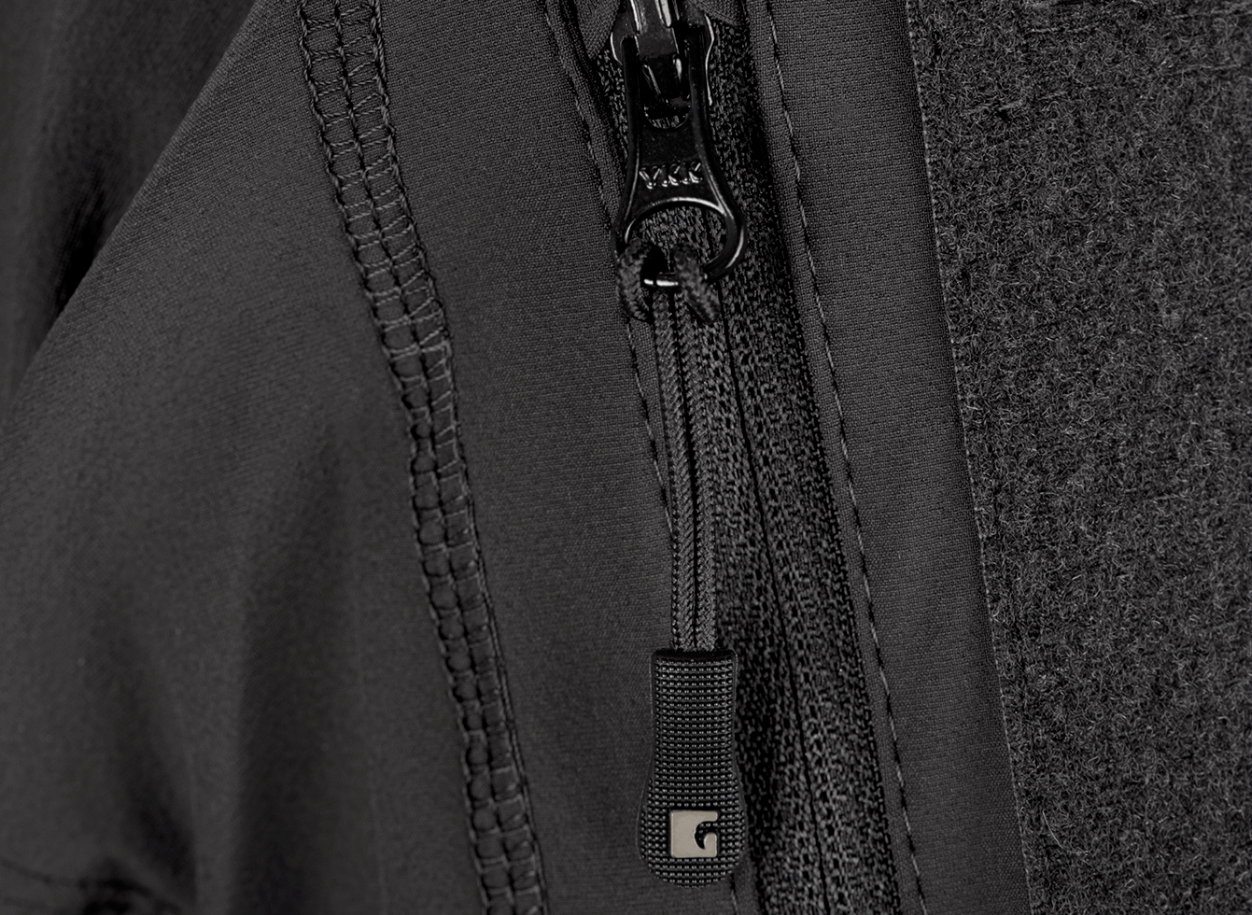 A nagyon ellenálló, rugalmas és vízlepergető anyagból készült ujjak technikai kialakítása rendkívül nagy mozgásszabadságot biztosít. A két felsőkarzseb elegendő tárolóhelyet biztosít, míg a hurokfelületek helyet biztosítanak az azonosító jelvényeknek és egyenként két rekesznek az írószerek számára.