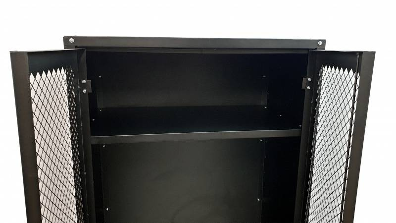 A TA-50 felszerelésszekrény 1,6 mm vastag acél polcokat tartalmaz a teljes szélességben. A középső és alsó polcok megerősítettek, így egyenletesen elosztva több mint 70 kg teherbírást biztosítanak. Az oszlopok oldalain lyukak vannak fúrva, hogy a polcok 100 mm-rel felfelé vagy lefelé mozgathatók legyenek. A polc alatti ø20 mm-es kerek acél függesztőrúd tökéletes a kabátok, egyenruhák és akár nehéz terepruhák felakasztásához. Ezek a felszerelési szekrények matt fekete porszórt bevonattal kaphatók. A TA-50 szekrény teljes mérete 2000 mm x 1000 mm x 600 mm.