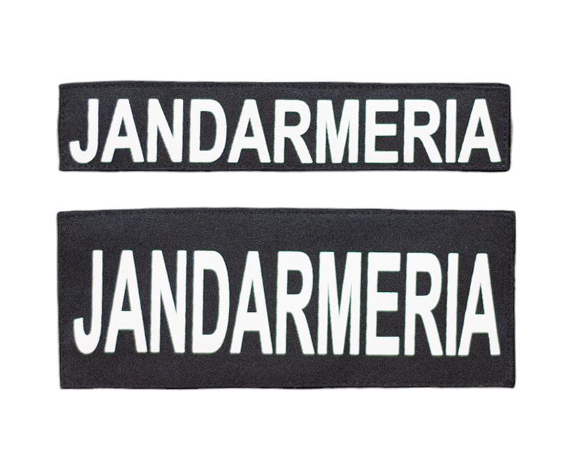 Set ecusoane textile cu aplicare tip Velcro (cu scai), pentru atașare pe echipamente (veste, jachete, etc.), inscripționate cu vopsea clasică "JANDARMERIA".