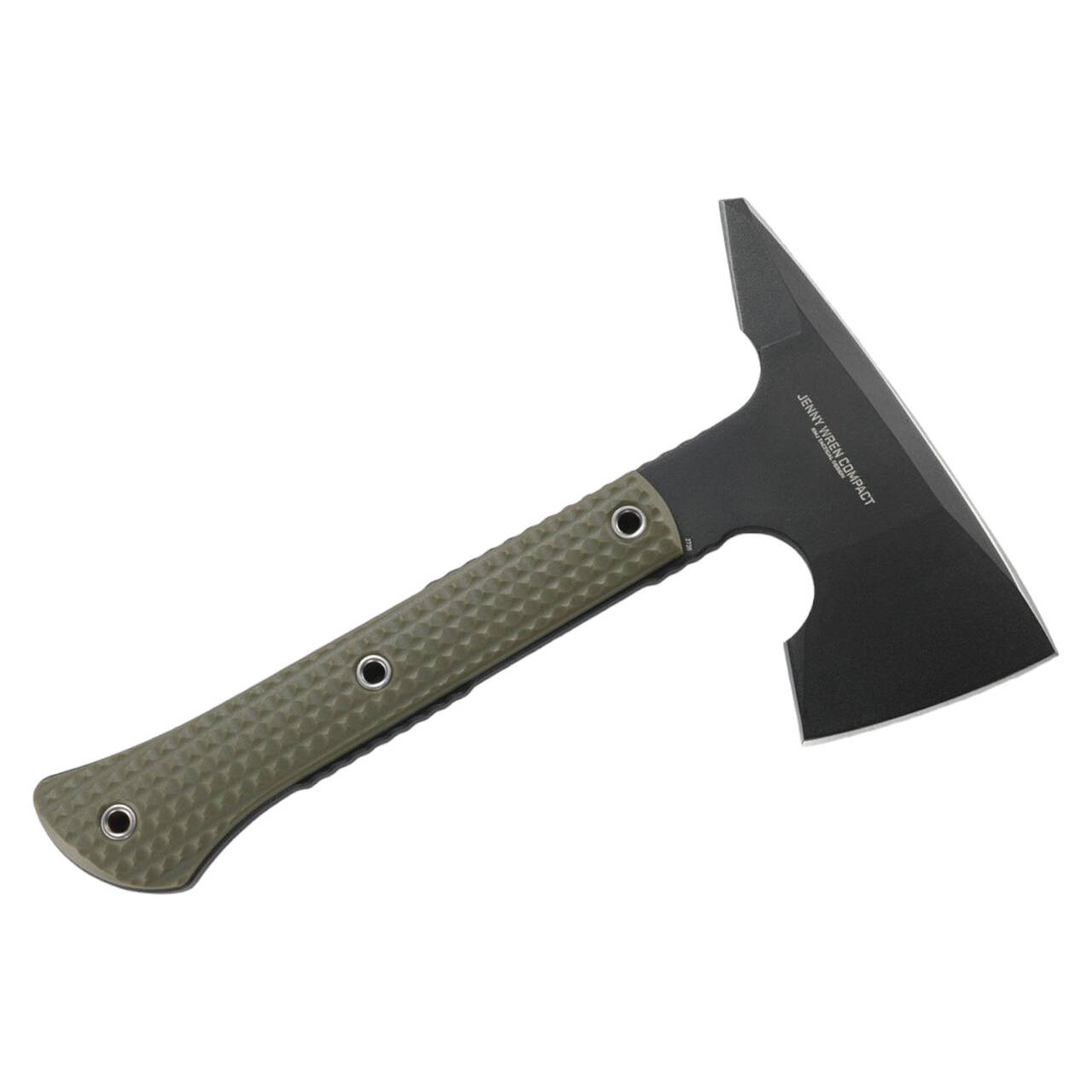 A Ryan Johnson által tervezett CRKT Jenny Wren Compact egy kompakt, mégis rendkívül robusztus fejsze, amely sokféleképpen használható. A fekete fej kiváló minőségű SK-5 szénacélból készült, porálló bevonattal rendelkezik, és gond nélkül ellenáll a nagyobb igénybevételeknek is. Az FRN-ből készült, rendkívül masszív nyél finom textúrájának köszönhetően még nedves körülmények között is nagyon jól manőverezhető. FRN-ből készült MOLLE-kompatibilis tokkal érkezik.