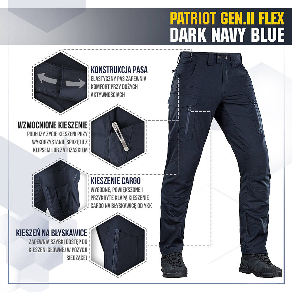 A Patriot Gen.II Flex taktikai nadrág edzéshez, lövészethez, munkához és üzleti utakhoz vagy kirándulásokhoz viselhető. Könnyű, egyszínű, egyszínű rip-stop anyagból készült: 63% poliészter, 35% pamut, 2% elasztán. Az átgondolt szabásnak köszönhetően a nadrág nem akadályozza a mozgásszabadságot, és könnyen viselhető taktikai és alkalmi ruhaként egyaránt.