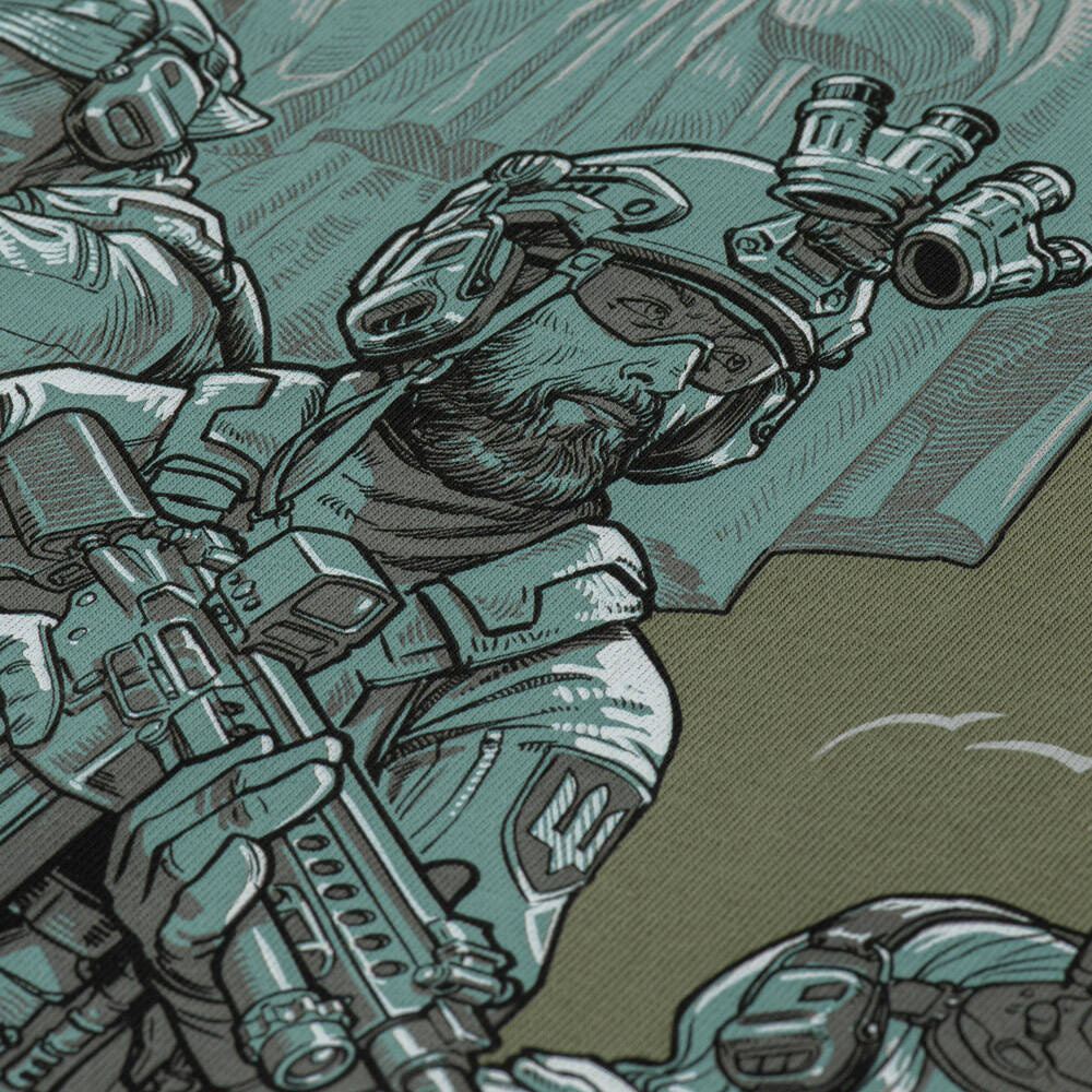 A nyomat a hadseregünket ábrázolja. Akik a háború első napjaitól kezdve a „világ második hadseregét” pusztítják. Tetteik megváltoztatják a világot. Mindegyikük egy-egy hős. A katonák mögött az anyaország áll - az anya, az ukrán nép megtörhetetlenségének szimbóluma. Pajzsa megvéd az ellenséges golyók ellen, kardja pedig méltó visszavágást ad az ellenségnek. Nyugodt és rendíthetetlen, olyan, mint minden ukrán honvédő. Nemtől, kortól és foglalkozástól függetlenül egy nagy cél - a győzelem - egyesíti őket.