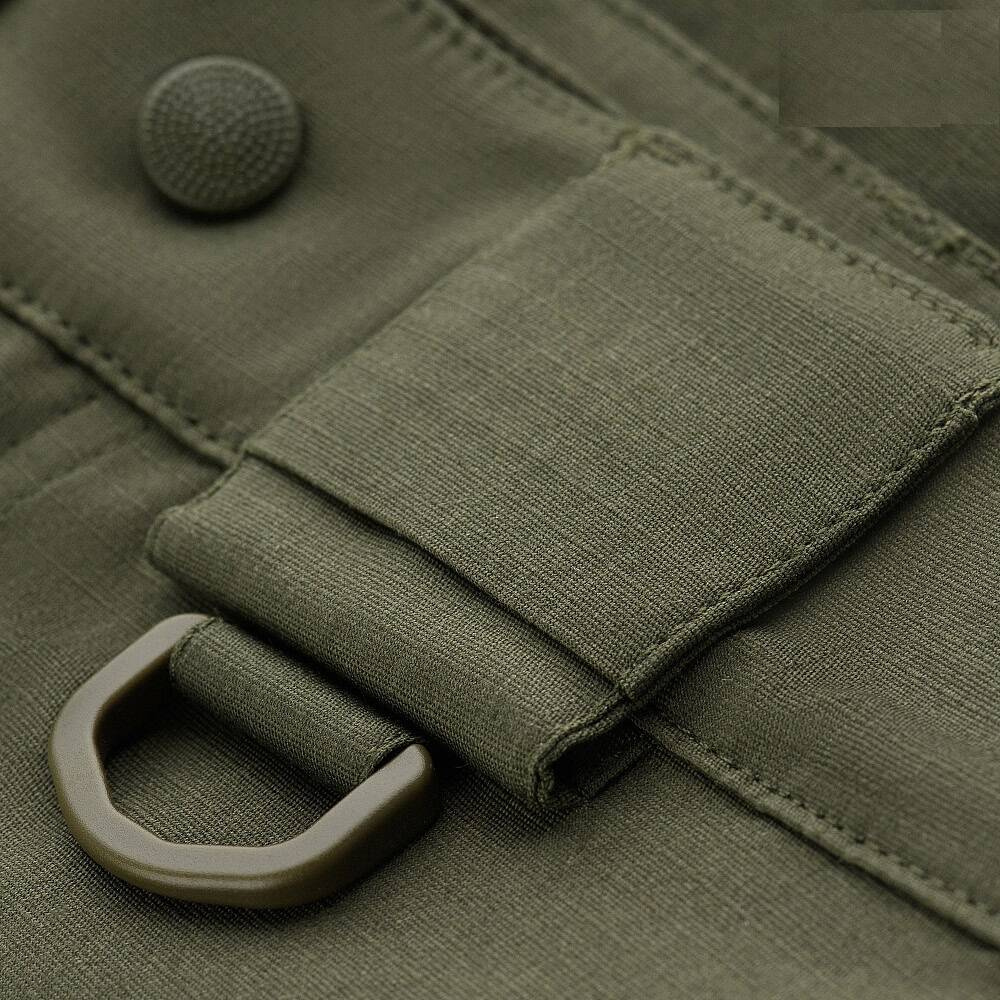 A rövidnadrág könnyű, egyszínű, teflon impregnálással ellátott, víz- és szennyeződésálló rip-stop anyagból készült. Összetétel: 64% pamut, 32% poliészter és 4% spandex. Az anyag kellemes testű poliészterből és pamutból készült, jó színtartósságú és nagyon tartós. A rövidnadrág tervezőinek fő feladata a mozgáskomfort fenntartása volt, és ezzel a feladattal száz százalékosan megbirkóztak - a rövidnadrág a könnyedség benyomását kelti, nem korlátozza a mozgást, és stílusos és szolid megjelenést biztosít. Kényelmes, széles zsebeket használtak megerősített betétekkel. A rövidnadrágot úgy tervezték, hogy legfeljebb 5,5 cm széles övvel viselhető legyen. A pántok elejére bármi rögzítésére szolgáló csatok (karabinerekkel) vannak varrva. Kiváló minőségű kiegészítők az YKK cégtől.