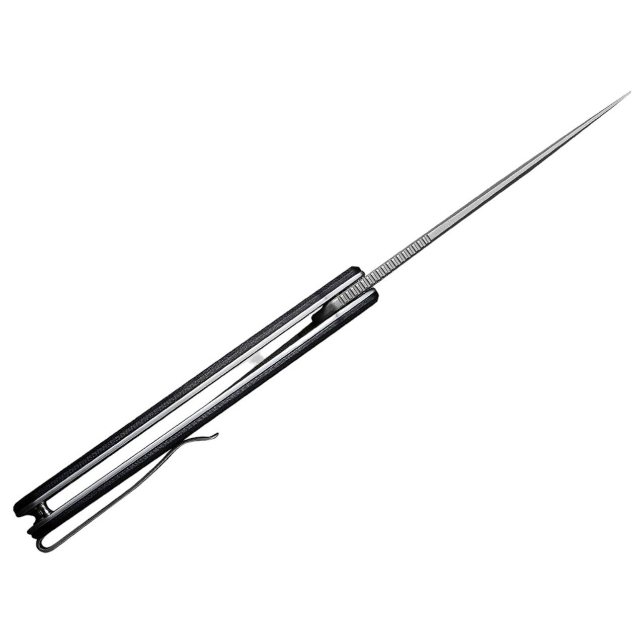 A Scitus mint karcsú úri kés nem csak vizuálisan nyűgöz le. A csapágyazott, D2 acélból készült egyenes penge kőmosott szürke kivitelben könnyedén megbirkózik a mindennapi vágási feladatokkal. A fekete G10 pikkelyes markolat és a hüvelykujjtámaszon található bevágások optimális fogást biztosítanak használat közben. A karcsú jelleget kiemeli a diszkrét flipper és a bélészár a penge nyitására és feloldására. Megfordítható klippel rendelkezik a tip-up viseléshez.
