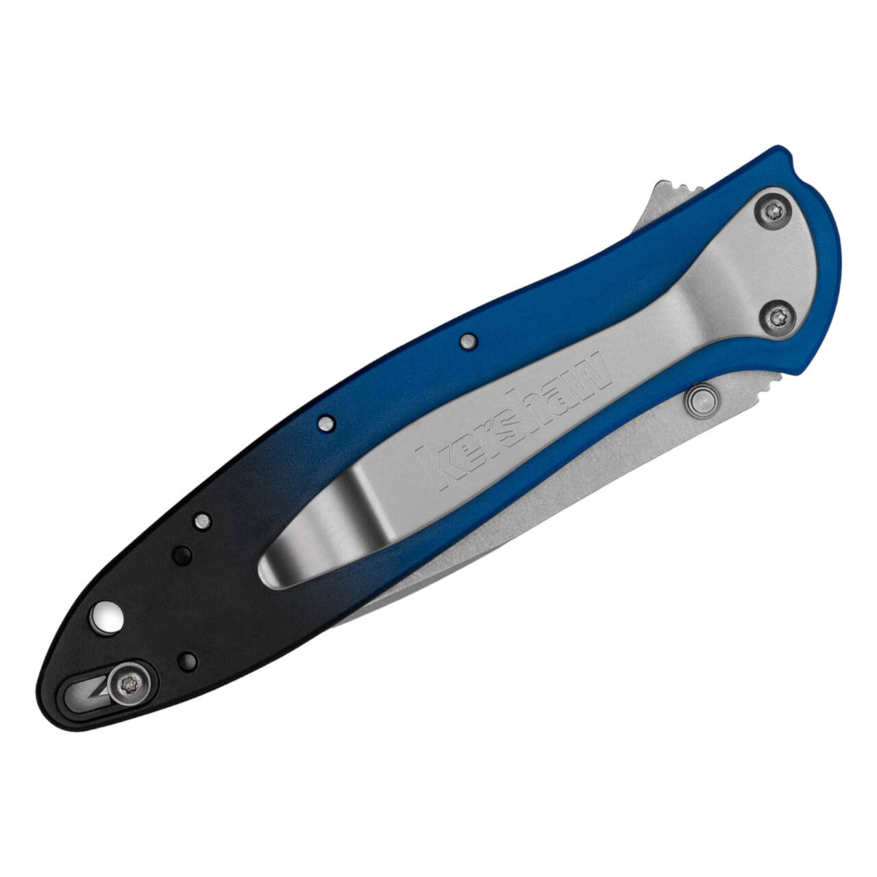 Ez a Kershaw póréhagyma határozottan szemet gyönyörködtető. A robusztus alumínium markolat összetéveszthetetlen színátmenettel rendelkezik a kekből a feketébe. A rozsdamentes CPM MagnaCut acélból készült penge rugós hüvelykujjas csappal nyílik, és megbízhatóan záródik a bélészárral. Megfordítható hordozókapoccsal (tip-up / tip-down) a hátlapon.