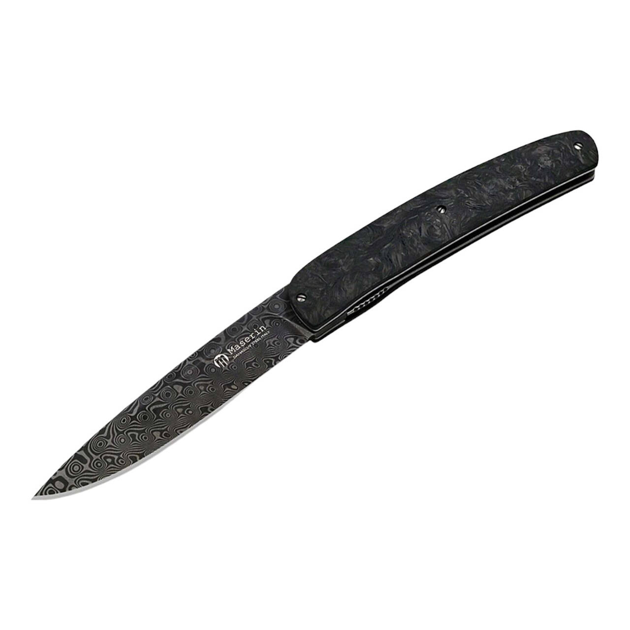 A Maserin Gourmet vékony vesper vagy steak kés nemcsak a pikniken, hanem a steakhouse-ban is jó figurát csinál. A szaténozott penge finom Rose Damaszkuszból készült, a pikkelyek fekete FAT Carbonból készültek és kiemelik ennek a zsebkésnek az eleganciáját. A kiálló pengegyökér lehetővé teszi a kényelmes egykezes nyitást, a bélészár pedig megbízhatóan reteszeli a pengét. Bőr tokkal szállítjuk.