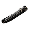Nevével ellentétben a WE Knife Riff-Raff megbízható zsebkésnek bizonyul, jó modorral és kiváló tulajdonságokkal. Mindig kéznél van a misztikus Heimskringla Damasteelből készült, golyóscsapágyazott Clippoint penge, amely hüvelykujjas csappal nyílik, és lenyűgöző mintázata tökéletesen harmonizál a bronz kontúrokkal ellátott fekete titán markolattal. A penge hátoldalán található bütykök növelik a keretzáras mappa üzembiztonságát, míg a szintén bronzból készült csavarok teszik teljessé a csillogó megjelenést. Tip-up klippel (r).
