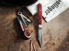 Az alaplapok klasszikusan sárgarézből, míg a bolerók nikkelezüstből készültek. Az USA-beli Mississippiből származó Chad Nichols által kézzel kovácsolt rozsdamentes damaszkuszi pengéje 200 réteggel és a Scrambled mintával győz meg. Biztonságosan záródik egy backlockkal, és gyönyörűen harmonizál a finoman szemcsés burlódi nyírfa pikkelyekkel, amelyeket az amboina vörös nemes árnyalatában festettek. Kézzel készül a solingeni Boker manufaktúrában, és szigorúan 999 darabra van limitálva világszerte. Az újra kiadott történelmi Boker fa emblémával, tanúsítvánnyal és nemes lebegő kijelzővel szállítjuk.