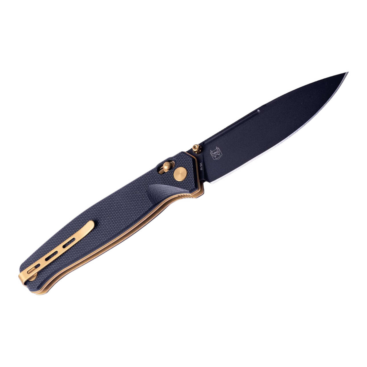 Ivan Braginets egyértelműen a Huggin mindennapi használatra való alkalmasságára összpontosít. Az elegáns EDC-kés fekete, VG-10-ből készült Spearpoint pengével van ellátva, és hüvelykujjas szegeccsel nyílik, a horony pedig taktikai jelleget kölcsönöz. Az enyhén ívelt és csúszásmentes G10 markolat kiegyensúlyozott érzést biztosít, míg a csúszózár megbízhatóan rögzíti és feloldja a pengét. Különösen figyelemre méltóak ennél a változatnál az aranyszínű elemek, mint például a csavarok vagy a tip-up clip(r), amelyek nemes megjelenést kölcsönöznek a késnek.
