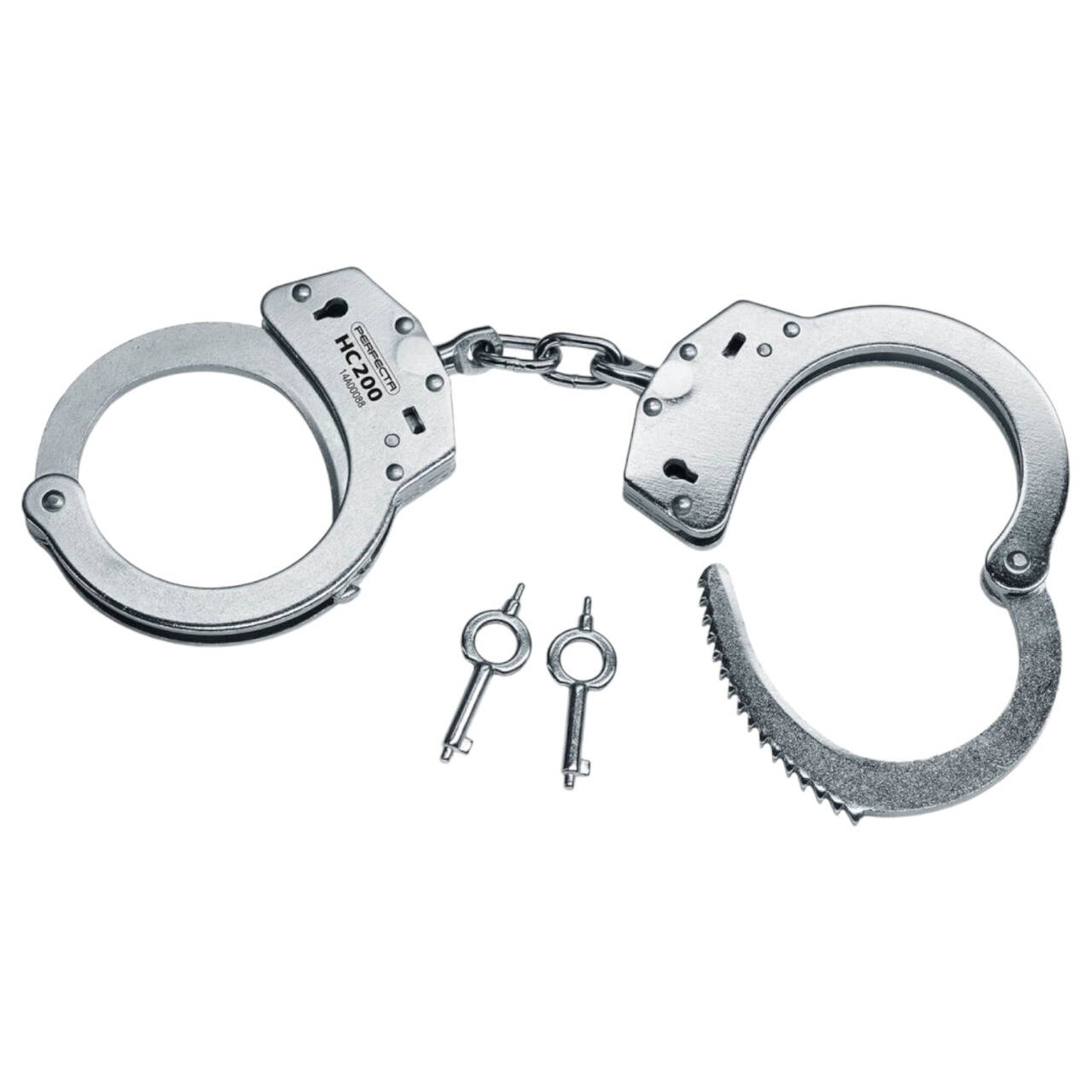 Nikkelezett acél bilincsek lánccal és kettős záró biztonsági rendszerrel.